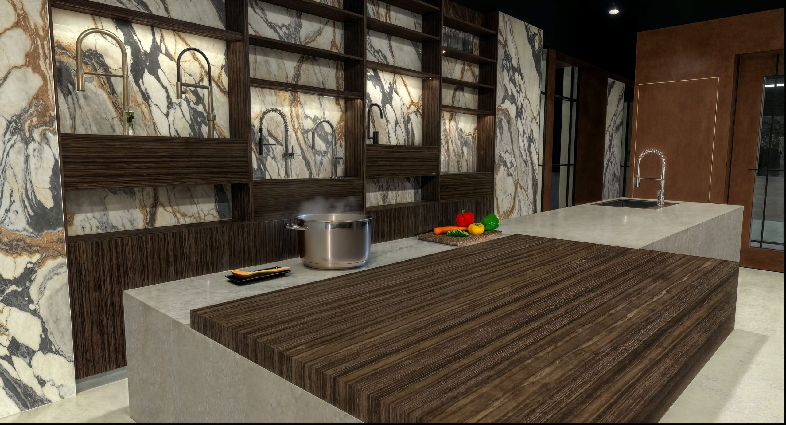 La travesía comienza ante imponentes monolitos: Calacatta Picasso, Amethyst, Mystic Stone y Travertino Rosso emergen como esculturas naturales. En sus vetas y texturas, la tierra habla. Aquí, el diseño se eleva a manifestación sensorial y la innovación rinde homenaje a la belleza de la naturaleza.