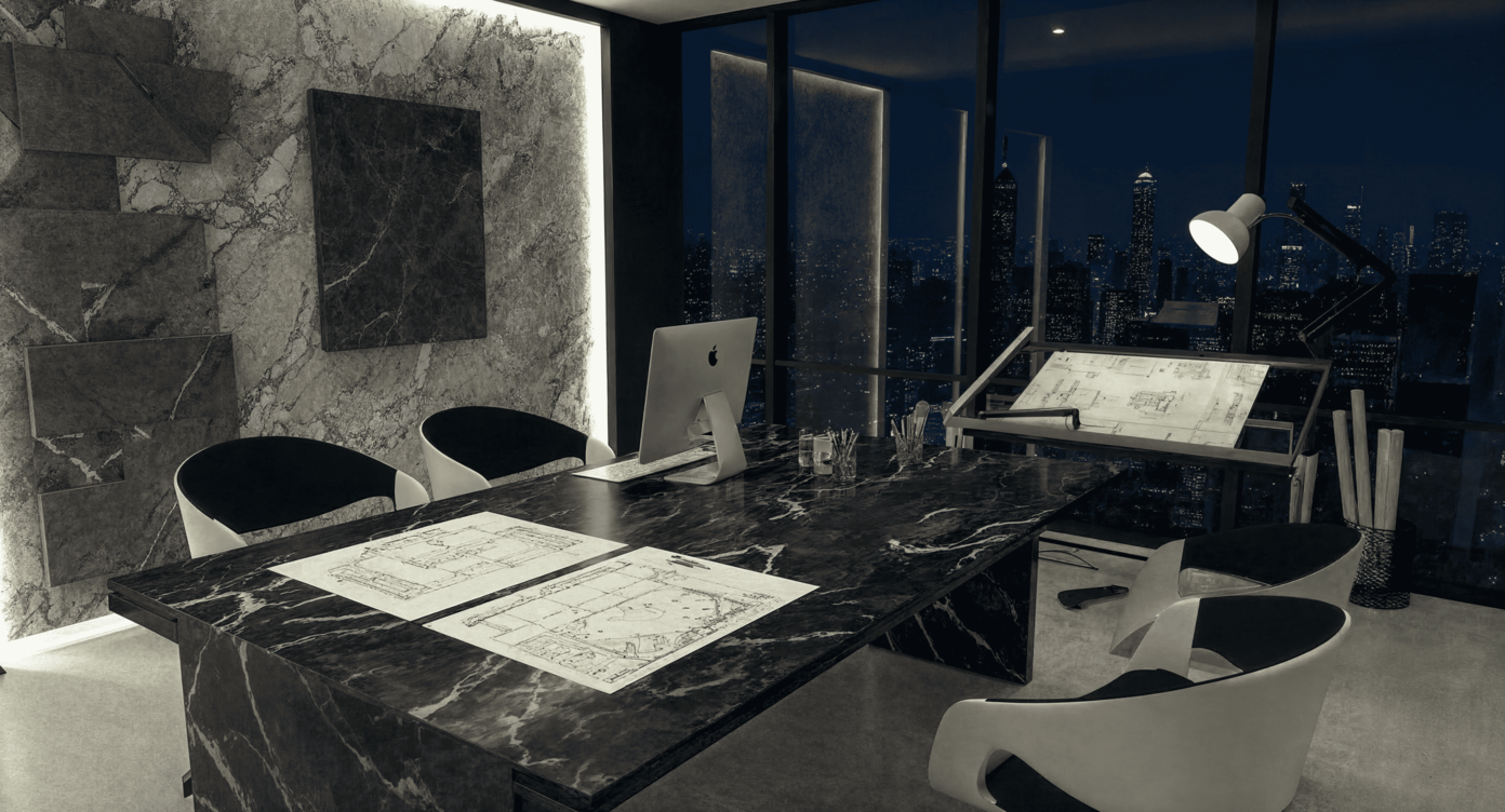 Ideas que nacen entre bocetos, tazas de café y sueños compartidos. En este estudio, el pensamiento se materializa. Mystic Stone y Intense Perle dan forma al interior, mientras Travertino Rosso y Revival transforman la terraza en un nido de inspiración.