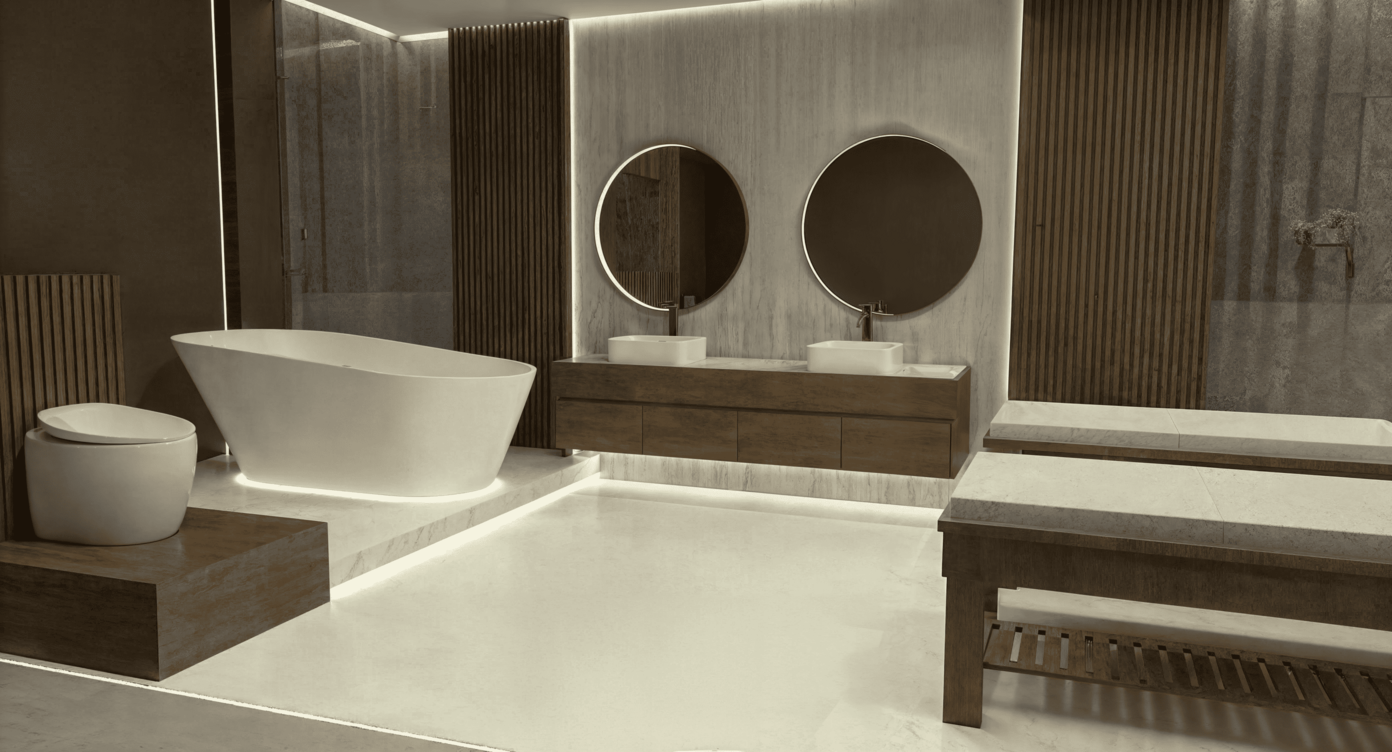 Un santuario de luz, silencio y agua. Aquí, el alma se reconecta. El aroma, con notas florales y verdes, envuelve el ambiente como un abrazo cálido. Amethyst en muros y Intense Clair en el piso crean un escenario donde cada ducha se transforma en un acto de autocuidado y conciencia.