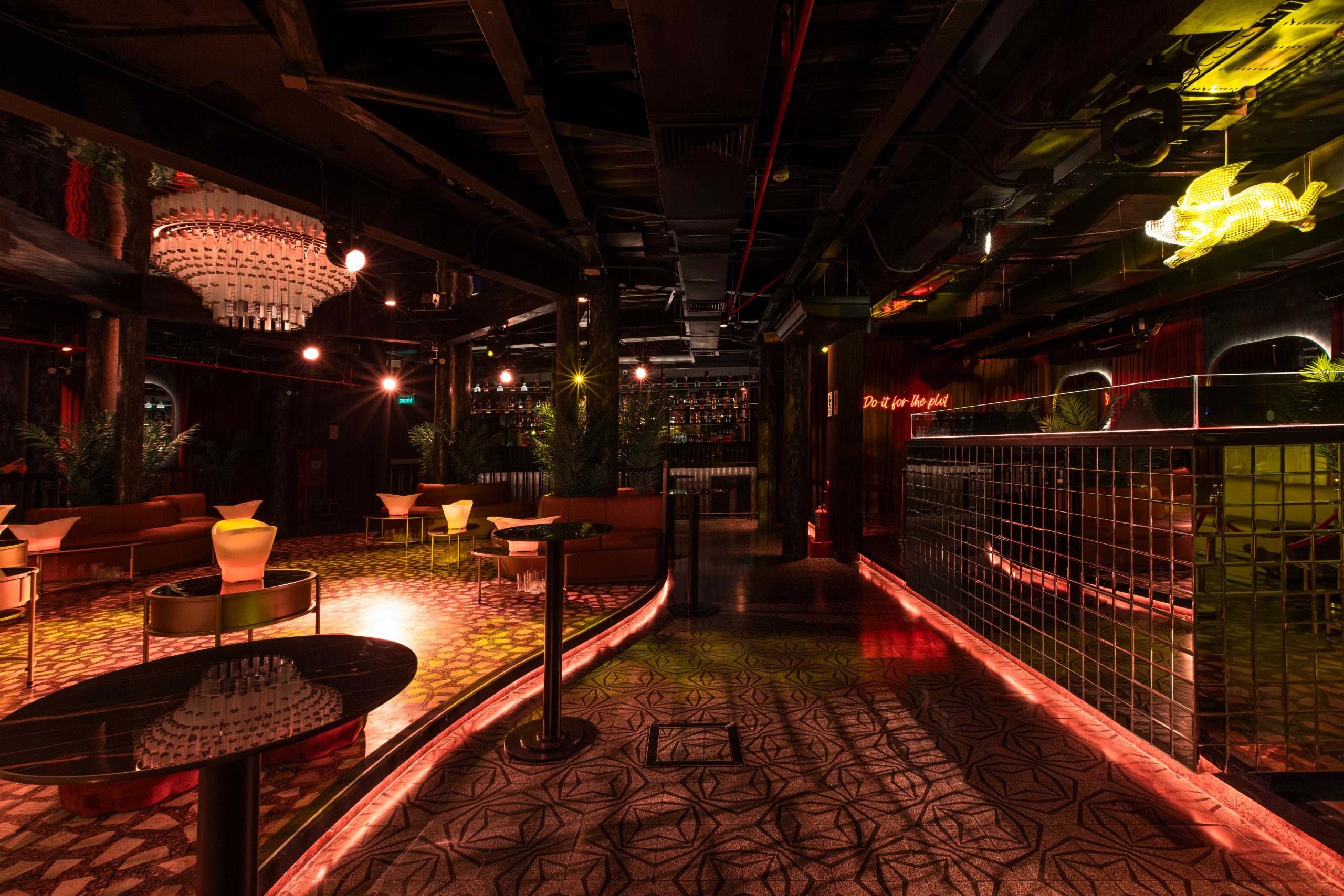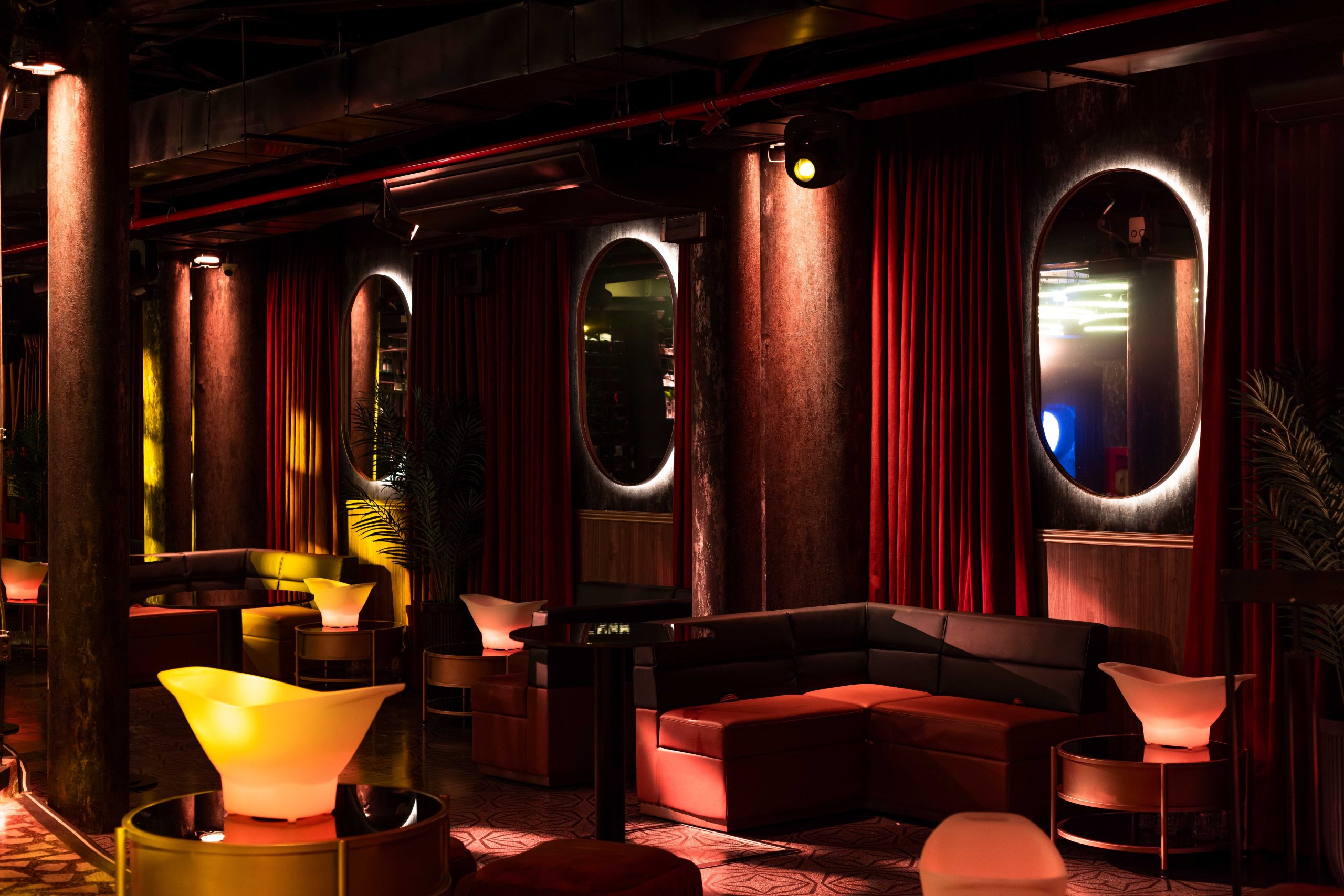 El interior se define por una cuidadosa selección de materiales: mármol oscuro, terciopelo, cerámicos vidriados y mosaicos en tonos ámbar crean una atmósfera envolvente y sofisticada. Las superficies reflejantes y los destellos metálicos amplifican la luz cálida y los acentos de neón, evocando el glamour de clubes clandestinos con una estética claramente contemporánea.