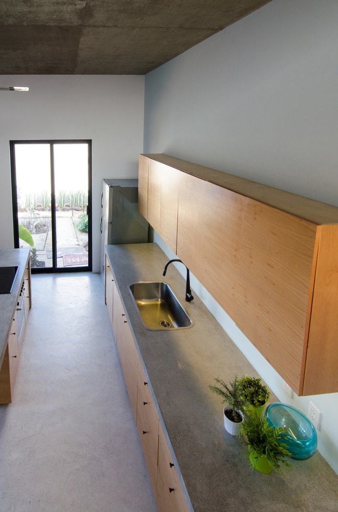 En el segundo piso se dio lugar a la cocina-comedor, tiene una isla de concreto aparente lo suficientemente larga que incluye la estufa y la mesa del comedor. La cocina, lugar de suma importancia en las casas mexicanas, funge como lugar de unión entre zonas sociales y zonas privadas.