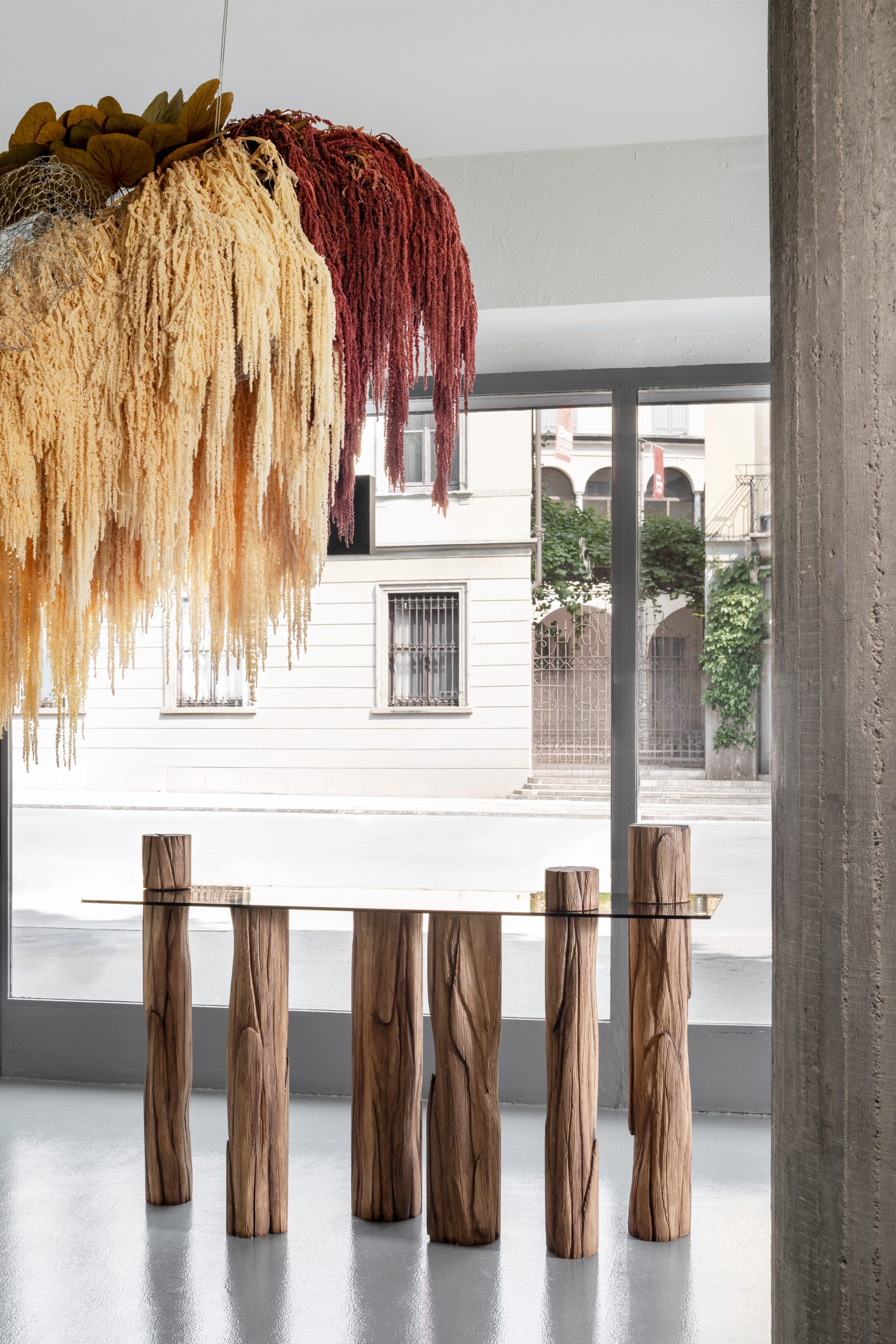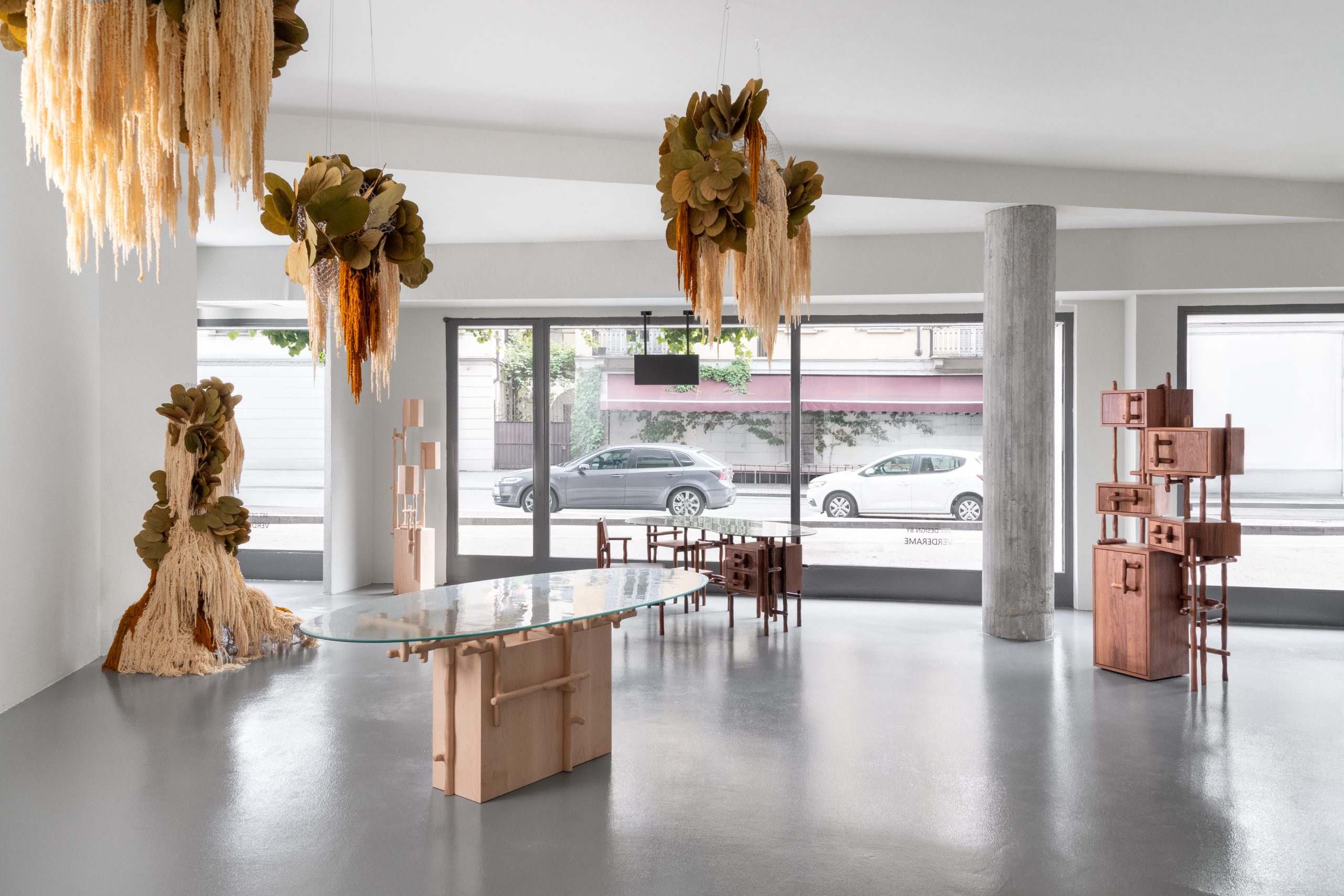 El montaje, diseñado por Verderame, amplifica el concepto de la exposición mediante una escenografía inmersiva. Siete esculturas botánicas se despliegan en el espacio a través de estructuras metálicas y elementos vegetales, generando un entorno donde lo natural y lo construido se entrelazan.