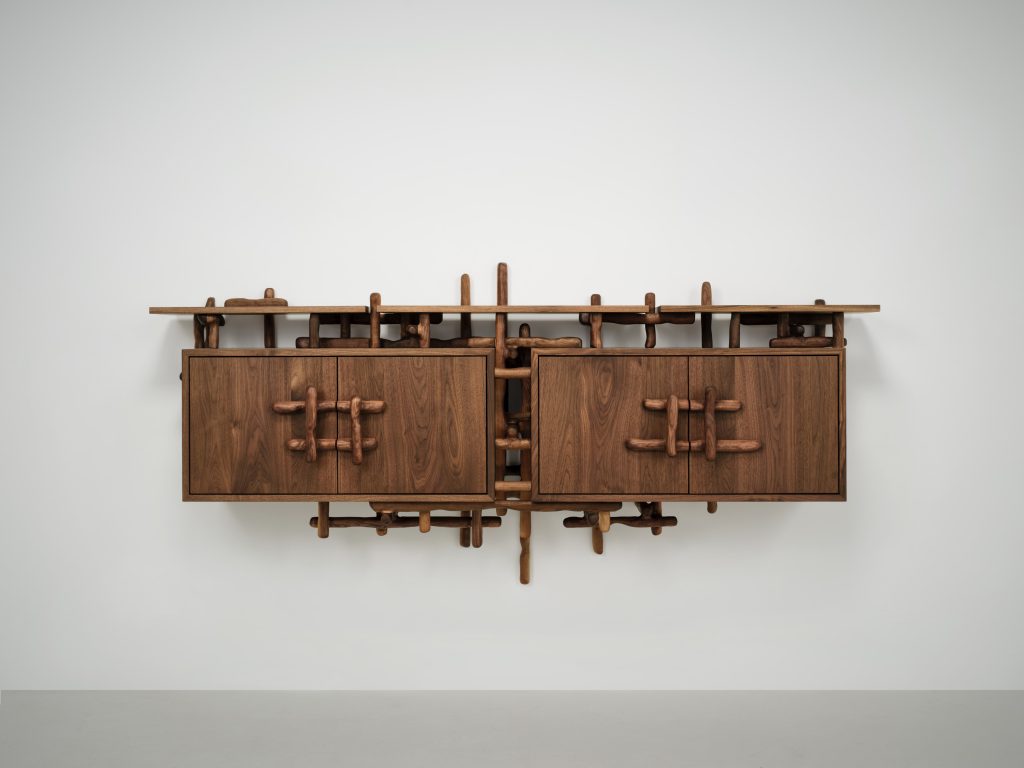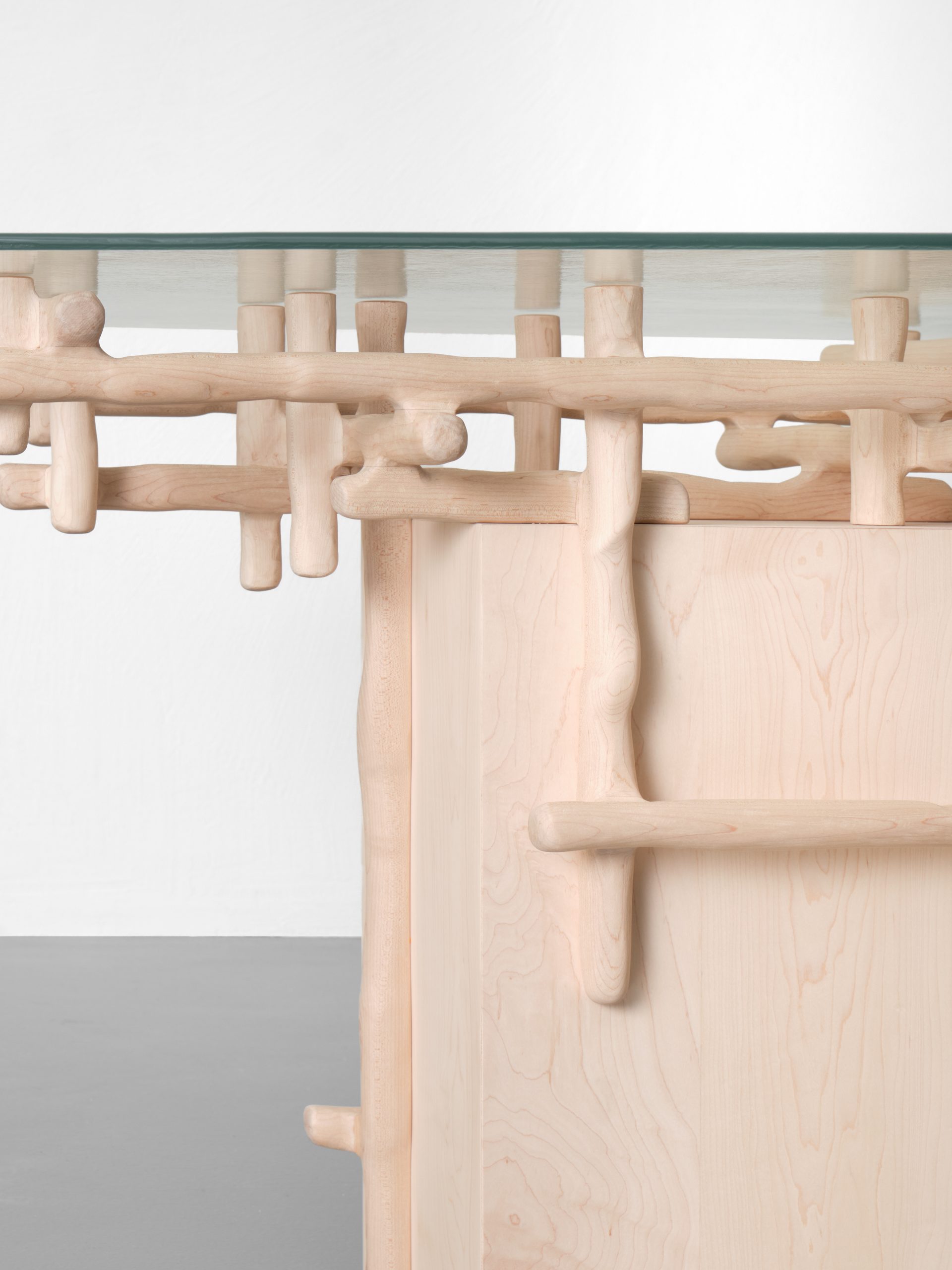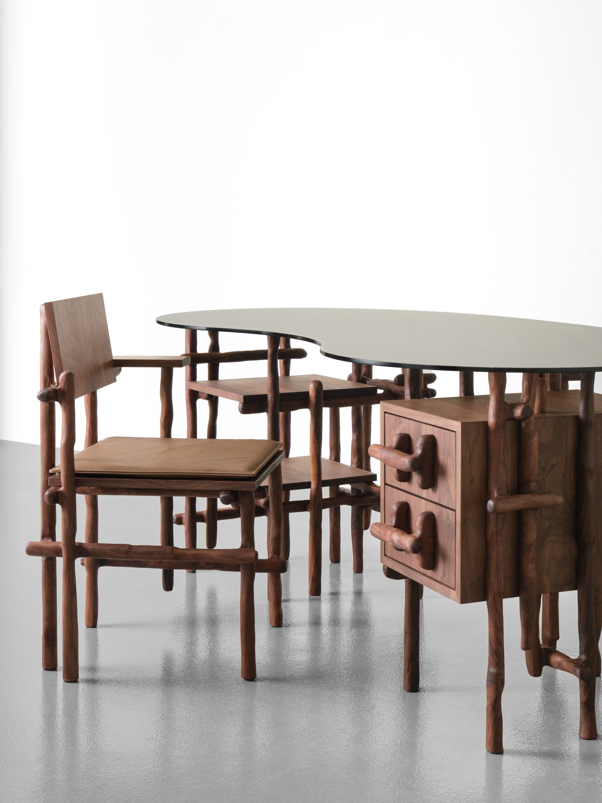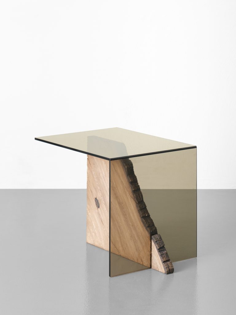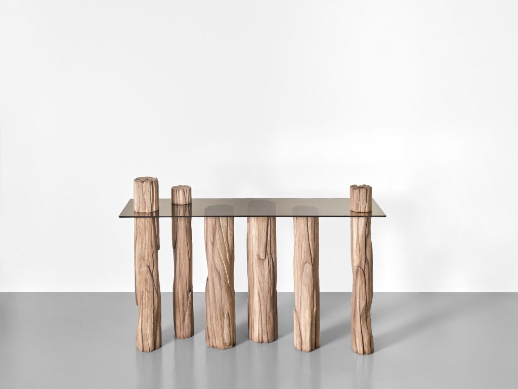 Mesas, escritorios, almacenaje y luminarias construidas principalmente en madera incorporan ahora vidrio, introduciendo un contraste entre solidez y ligereza. Este diálogo material genera una lectura más compleja de los objetos, donde la percepción cambia según la luz, la escala y la interacción con el entorno.