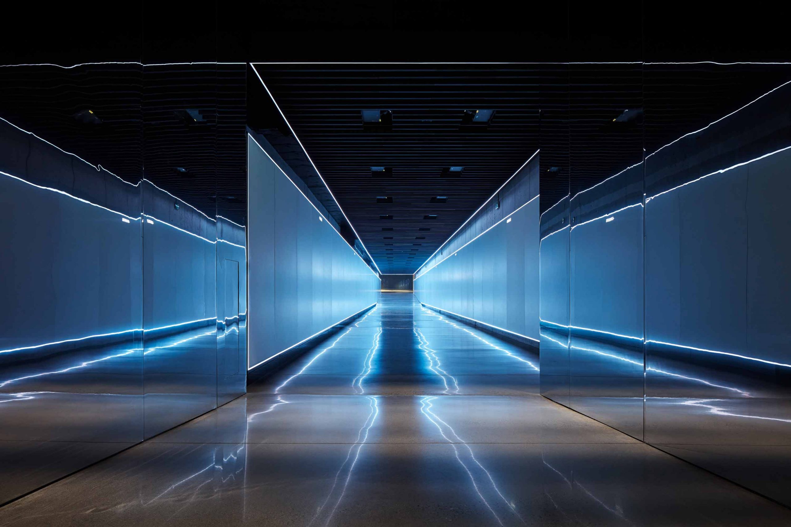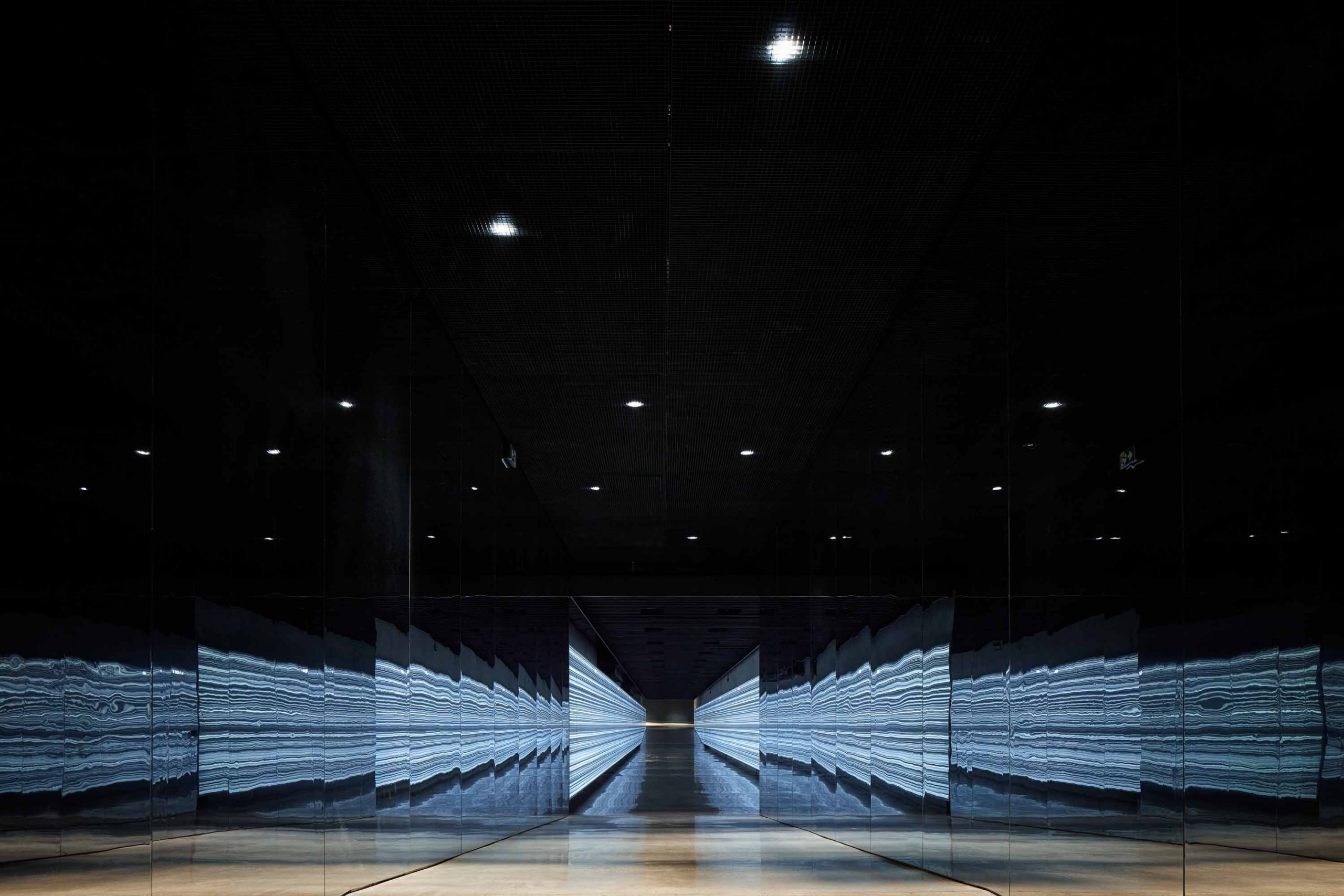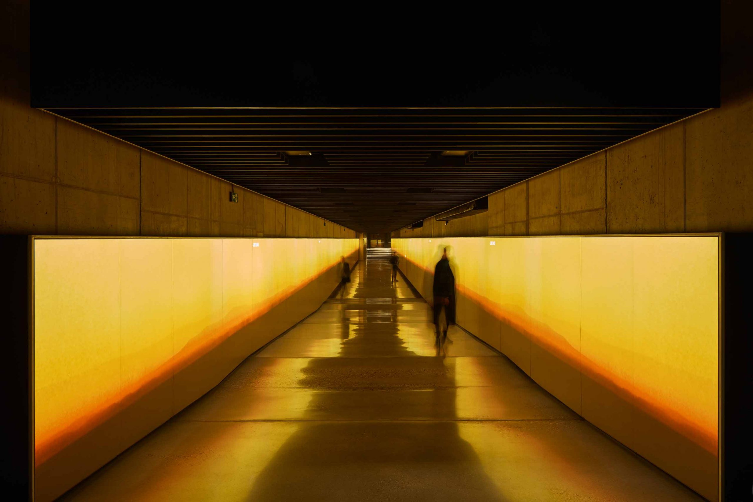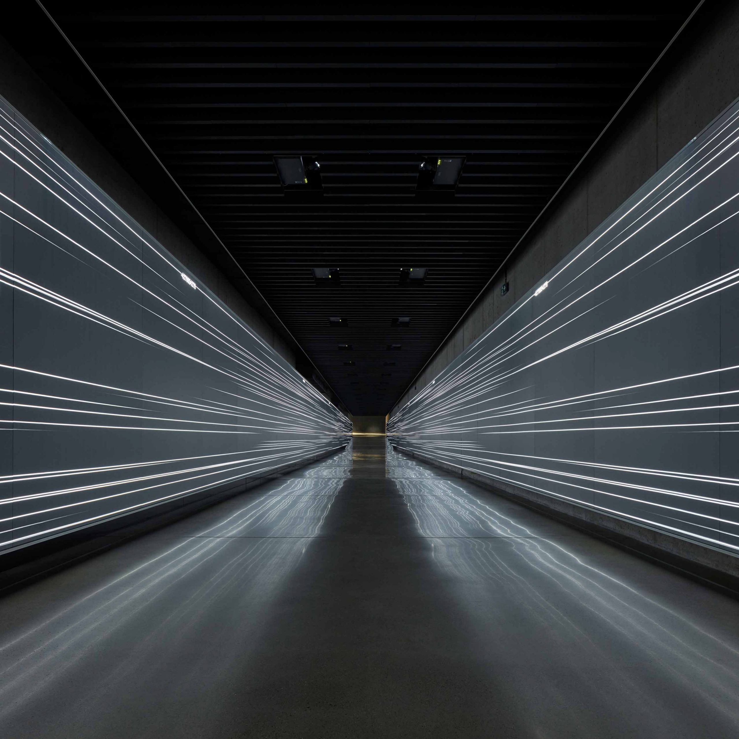 El colectivo de diseñadores, arquitectos, urbanistas y pensadores: Kolmo ha sumado su talento a Loom on the Moon y Pink Productions y, en conjunto, han insertado tres cuerpos con una longitud de 56 metros en el túnel, con la idea de crear un espacio para la transmisión del tiempo.