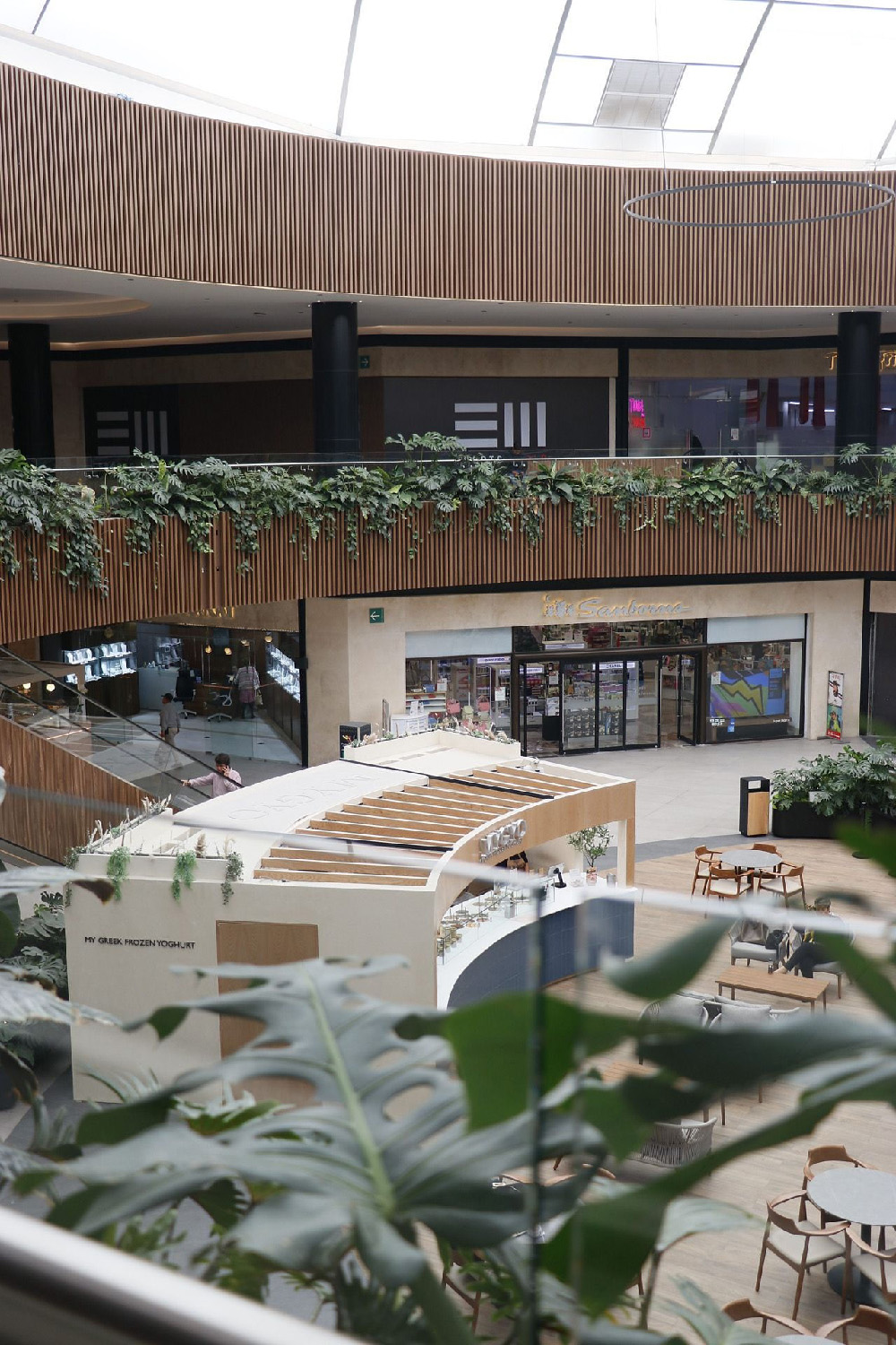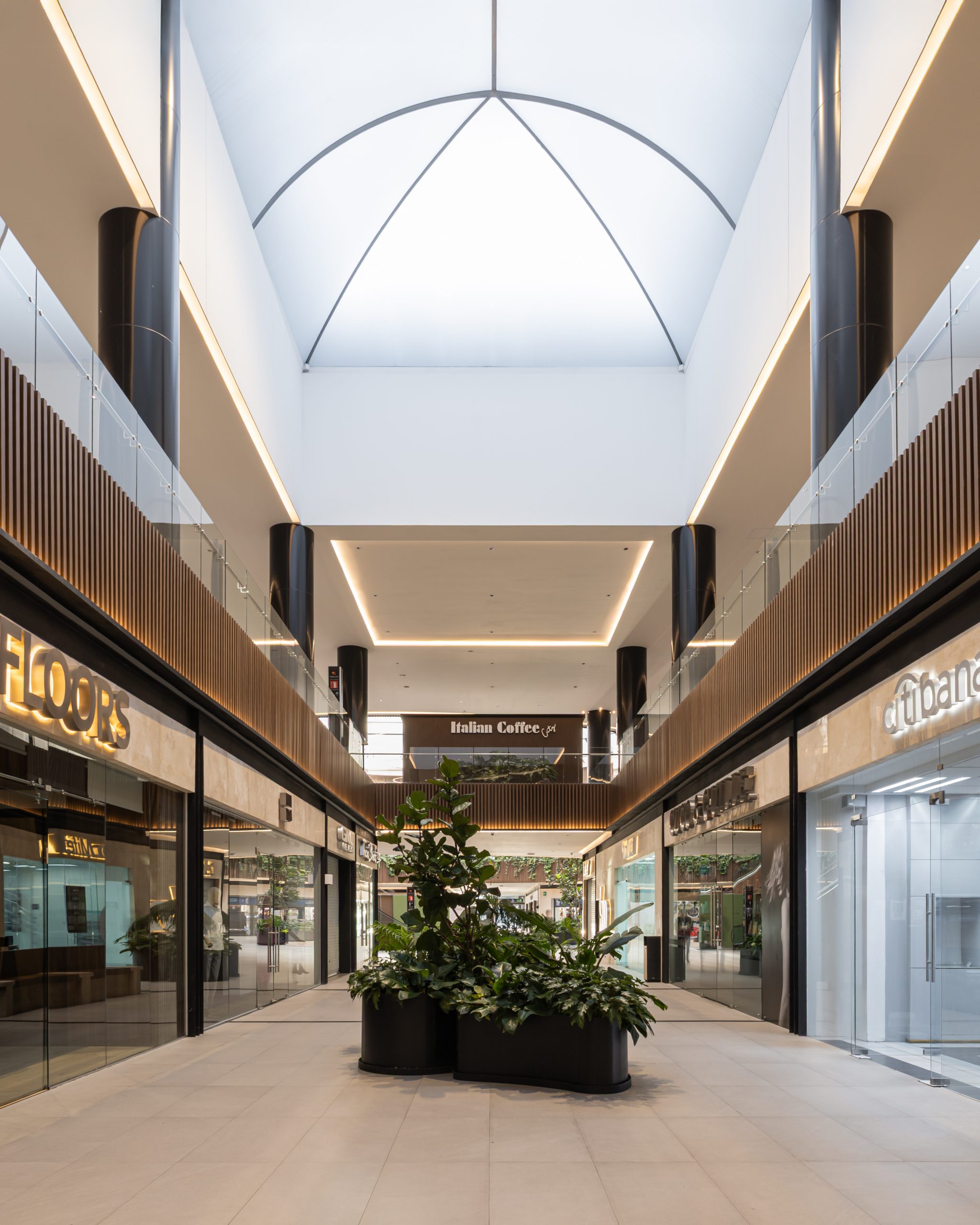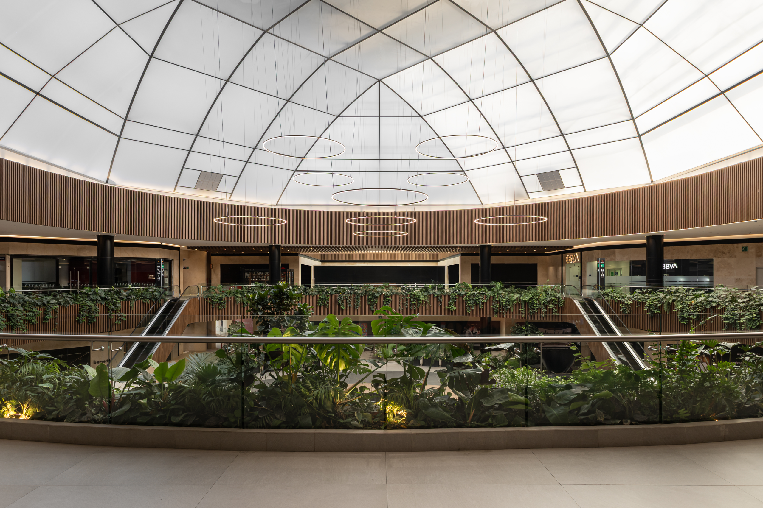 En el interior, el corazón del proyecto es una plaza elíptica coronada por un domo translúcido: aros de luz suspendidos orbitan sobre una fuente central, mientras una banda continua de vegetación desborda las barandillas y aterriza en jardineras a nivel de piso. La circulación fluye en curvas suaves; la paleta cálida y los ritmos de madera afinan la acústica y la experiencia sensorial de los usuarios.