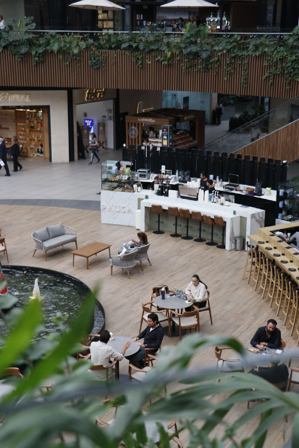 Pabellón Bosques se concibe como un enclave retail cuidadosamente compuesto. Cuenta con 13 restaurantes independientes con terrazas orientadas hacia una explanada central de aproximadamente 1,200 m², que funciona como punto de encuentro activo y verde. Se reorganizaron los flujos vehiculares y peatonales mediante un motor lobby, y se añadió un nuevo acceso con paradero de autobús para mejorar la conectividad con transporte público. Materiales acústicos integrados en plafones y aleros mitigan el ruido urbano y elevan la calidad ambiental interior.