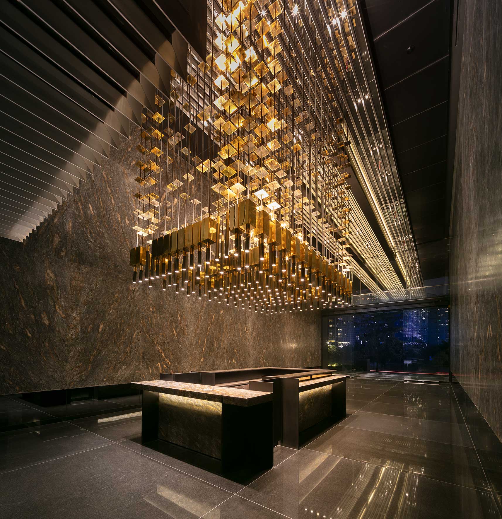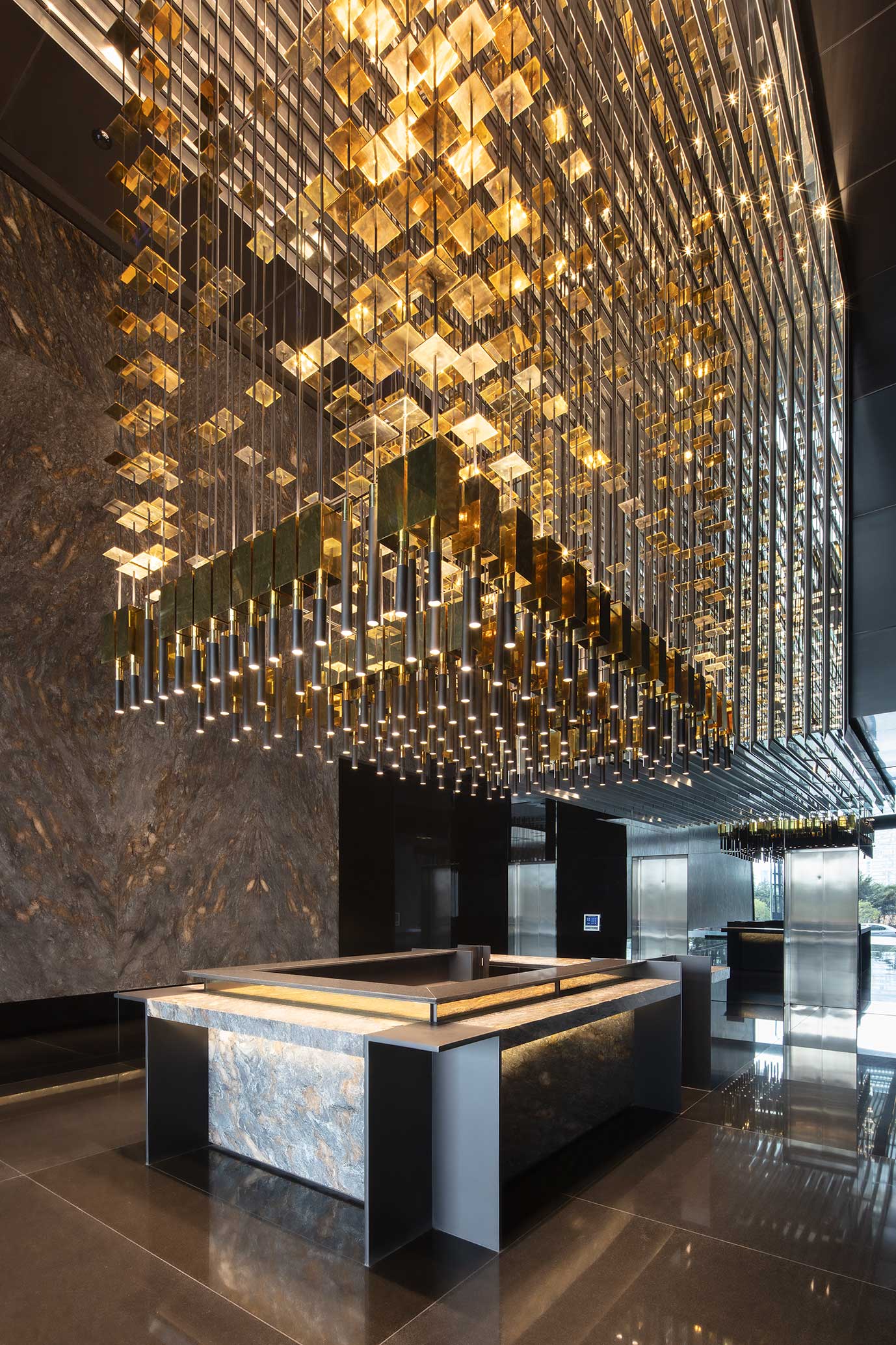 El edificio integra comercio, oficinas y amenidades en una estructura continua. Los primeros niveles se retraen para liberar el plano urbano y generar una secuencia de llegada donde acceso, lobby y circulación vertical se convierten en experiencia espacial. Un gran vacío central articula luz, reflejos y materialidad, evitando el gesto decorativo para privilegiar la atmósfera.