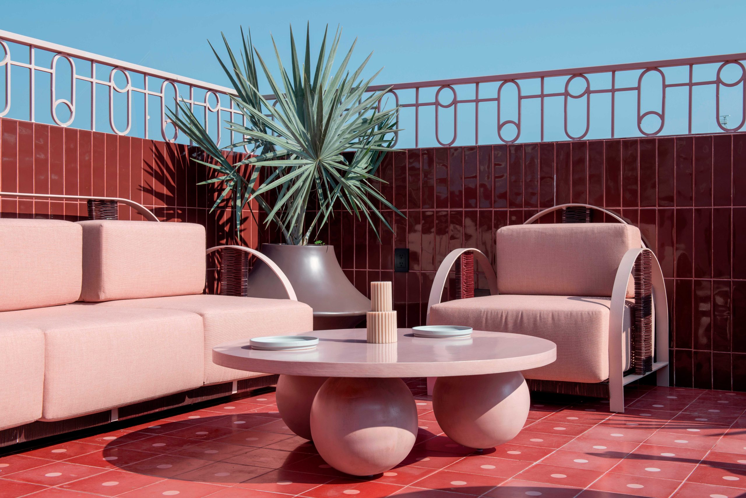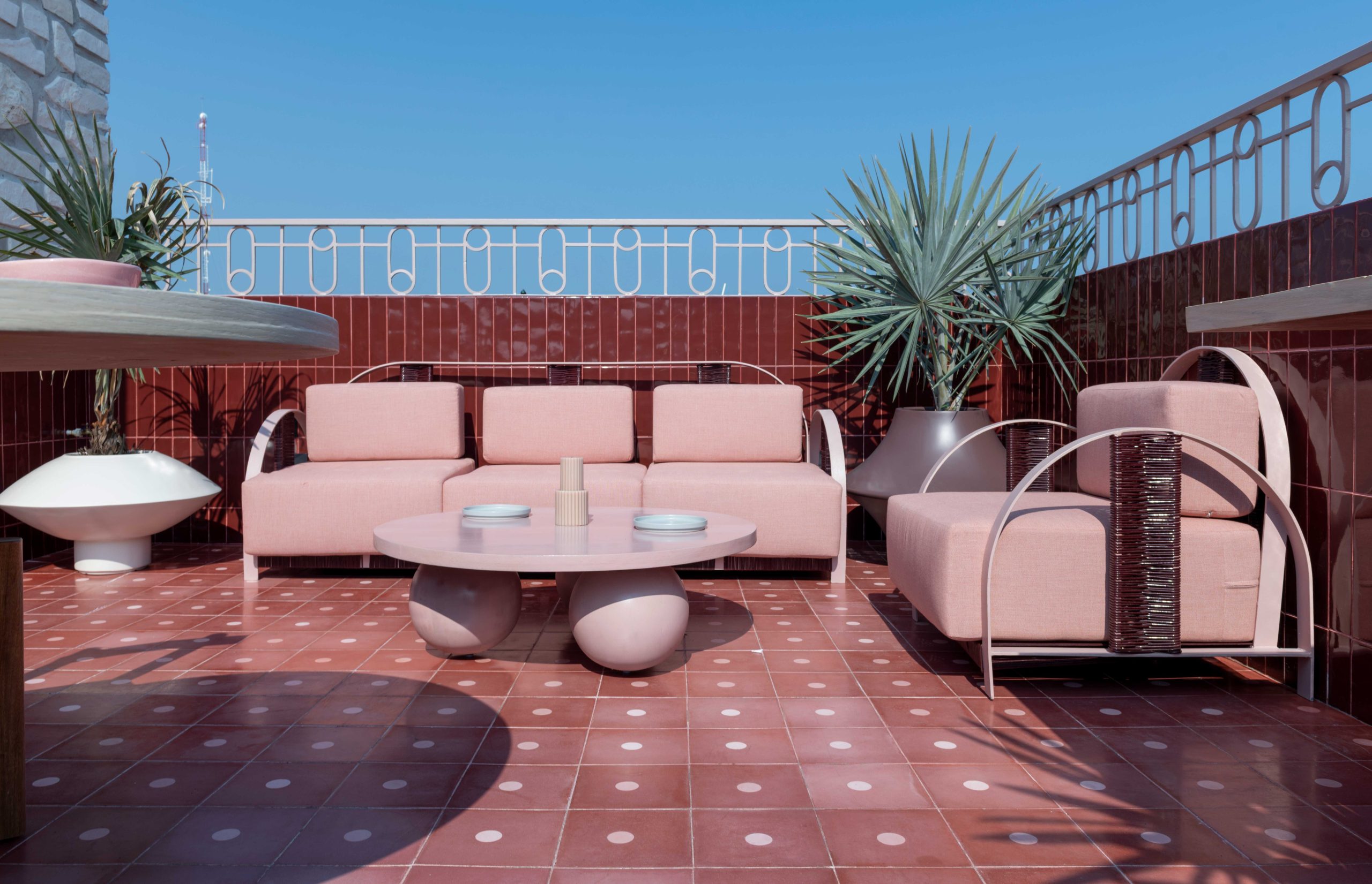 Más que una terraza, Red Bamba funciona como un nodo de encuentro. La barra semicircular, recubierta en terrazo, actúa como pieza central que articula el espacio social. Materiales como fibras naturales, madera y textiles en tonos suaves aportan una dimensión táctil que complementa la intensidad cromática del conjunto.