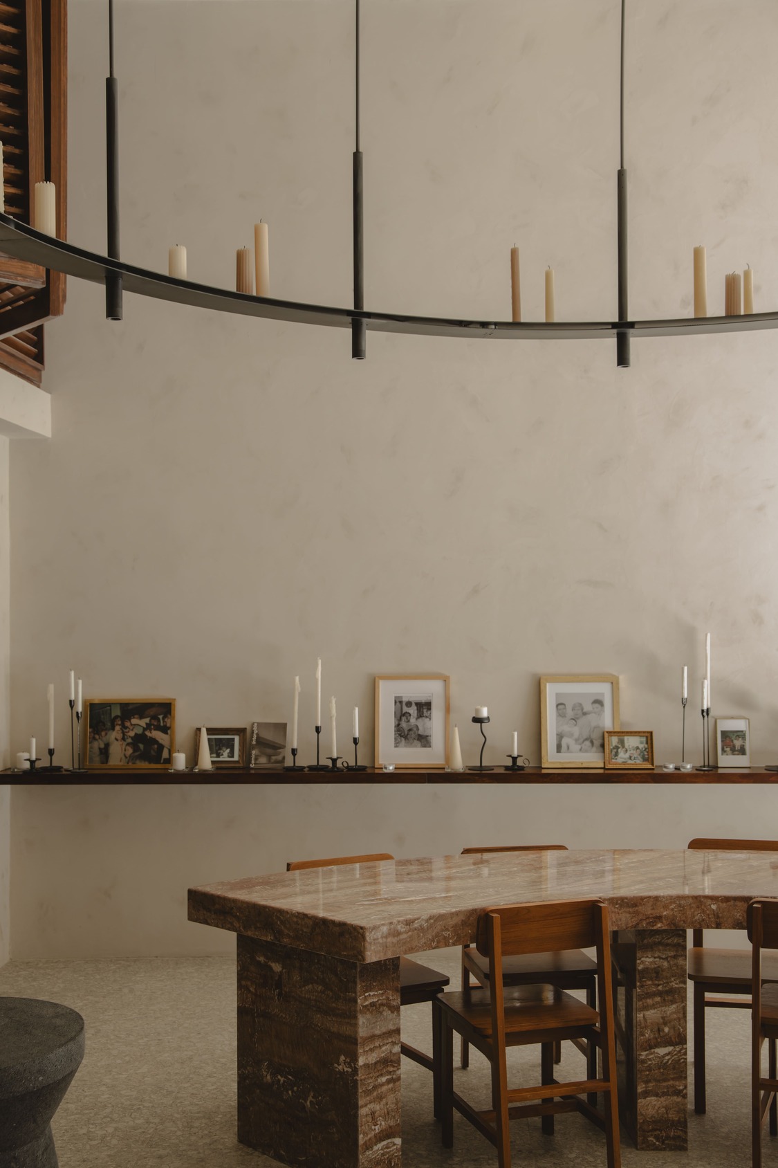 Sobre ella, una estructura lumínica circular, diseñada por Andros, acompaña la escena y acentúa la sensación de encuentro. Muros con detalles de latón sostienen velas y aportan una calidez íntima, mientras las piezas de piedra y madera distribuidas en el mobiliario y las luminarias recuerdan la permanencia y la raíz.