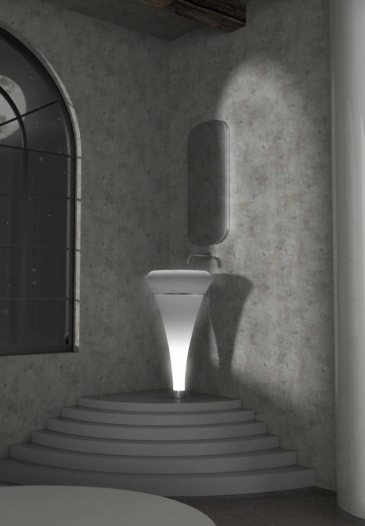 De forma elegante, formas sinuosas y una función sorprendente, Isola Murano es el nuevo lavabo de pie diseñado por Alessandro Lenarda para Glass Design. Se presenta como un mueble emotivo y particular porque al mismo tiempo de que la pieza es un lavabo también es una lámpara de pie, fácil de colorar en cualquier ambiente de baño.
