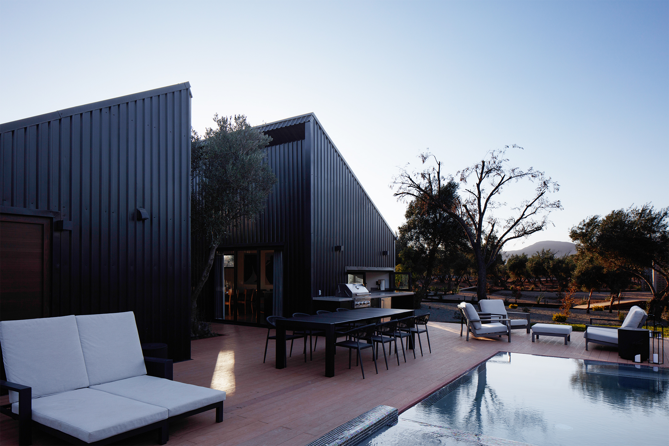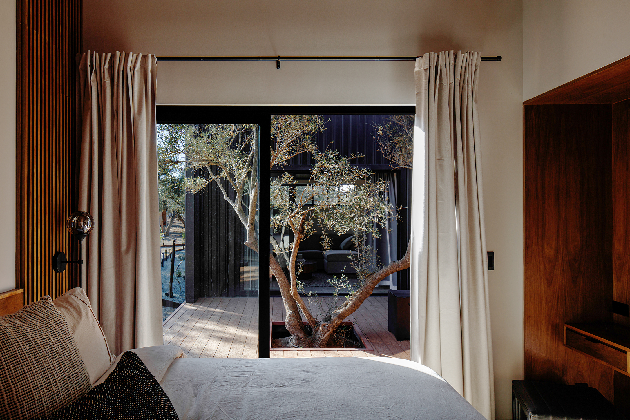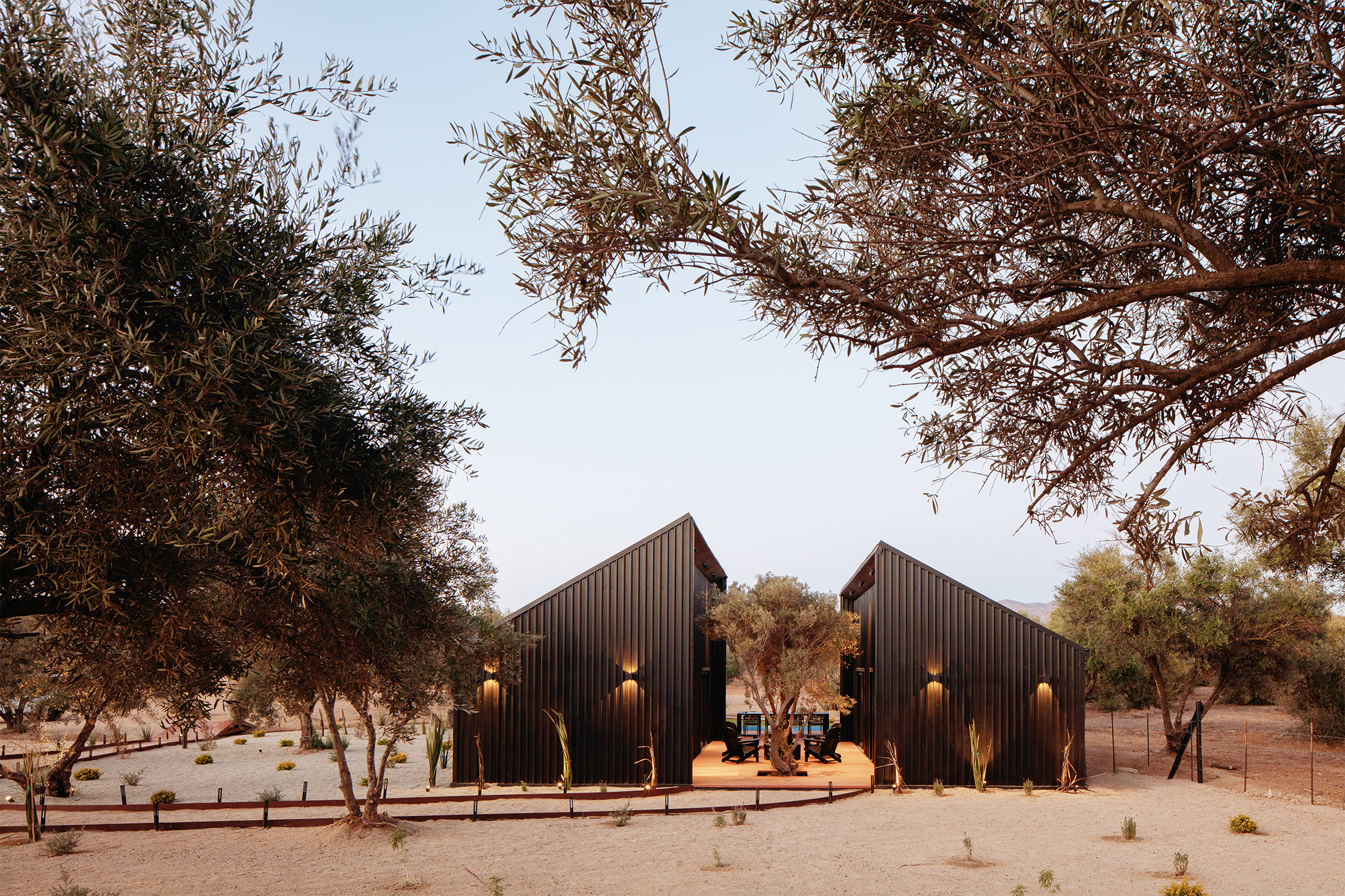 El proyecto se compone de dos volúmenes paralelos que delimitan un patio central, espacio que articula la vida doméstica y define el carácter del proyecto. Este patio funciona como centro social, zona de transición y mecanismo climático. Los olivos maduros trasplantados desde el propio terreno generan sombra natural y una atmósfera fresca, mientras que la orientación arquitectónica favorece la circulación del viento y la entrada controlada de la luz del sol característico de Baja California.