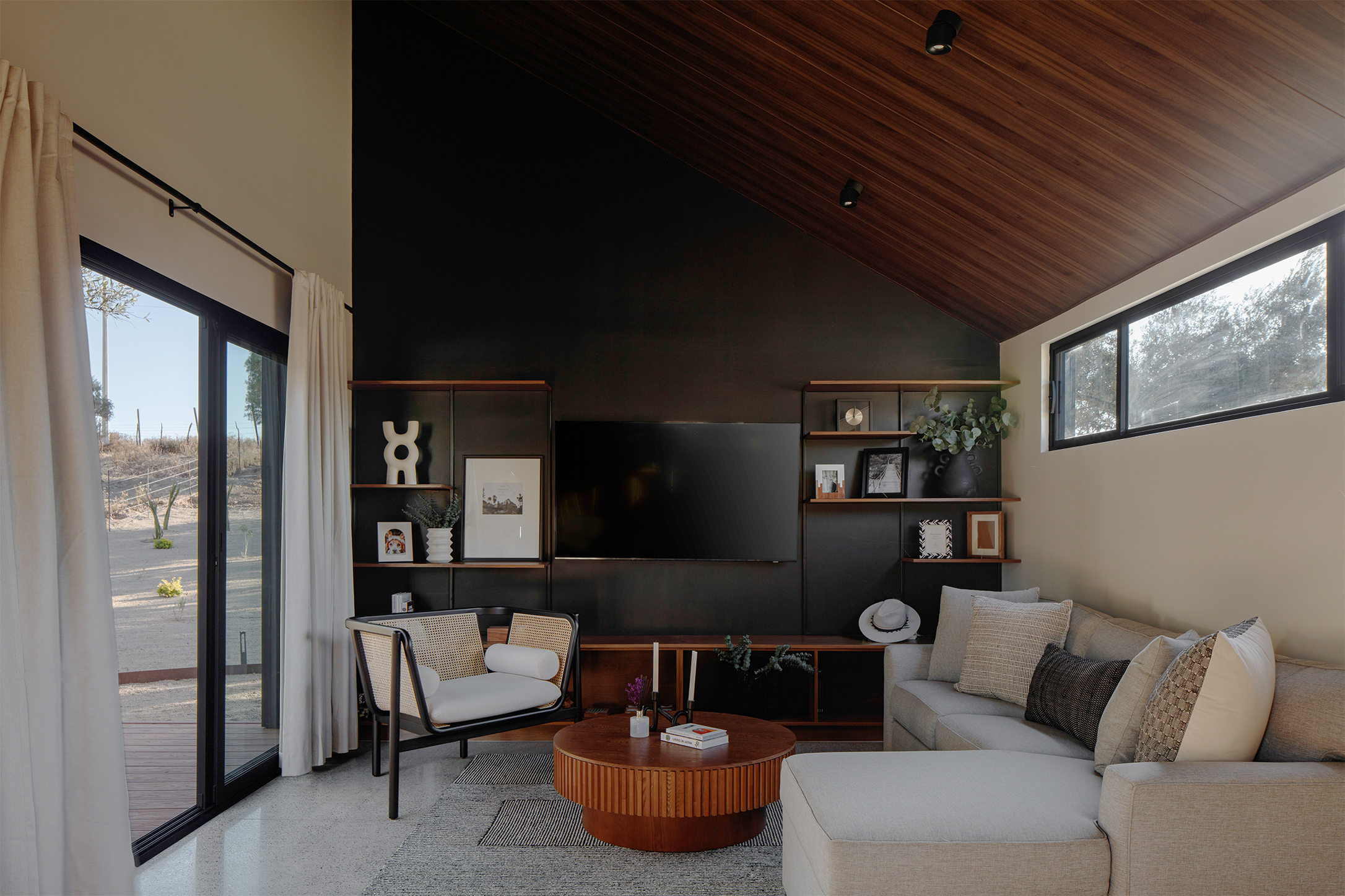 La identidad de Serentha Cabin se sostiene en una honestidad material que refleja su territorio. La envolvente de lámina metálica corrugada protege del clima extremo y ofrece un carácter industrial que dialoga con la rudeza del paisaje vitivinícola. En el interior, pisos de concreto pulido, muros de tablaroca pintada y plafones en chapa de madera crean una combinación equilibrada entre neutralidad y calidez.