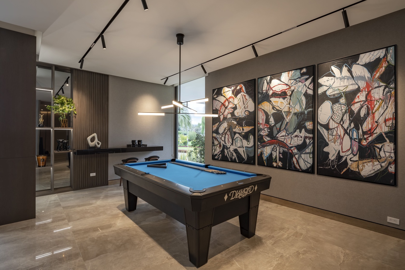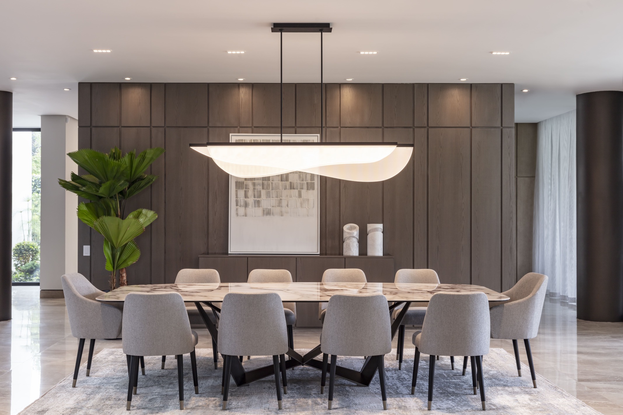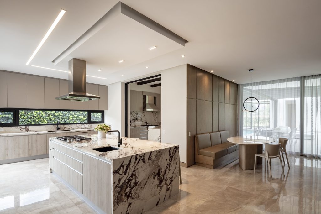 En el comedor, una mesa de mármol con base escultórica domina la escena, acompañada por una lámpara colgante de líneas puras y sillas tapizadas en tonos neutros que aportan equilibrio y confort. Cada pieza fue seleccionada para dialogar con el entorno, transmitiendo una elegancia atemporal.
