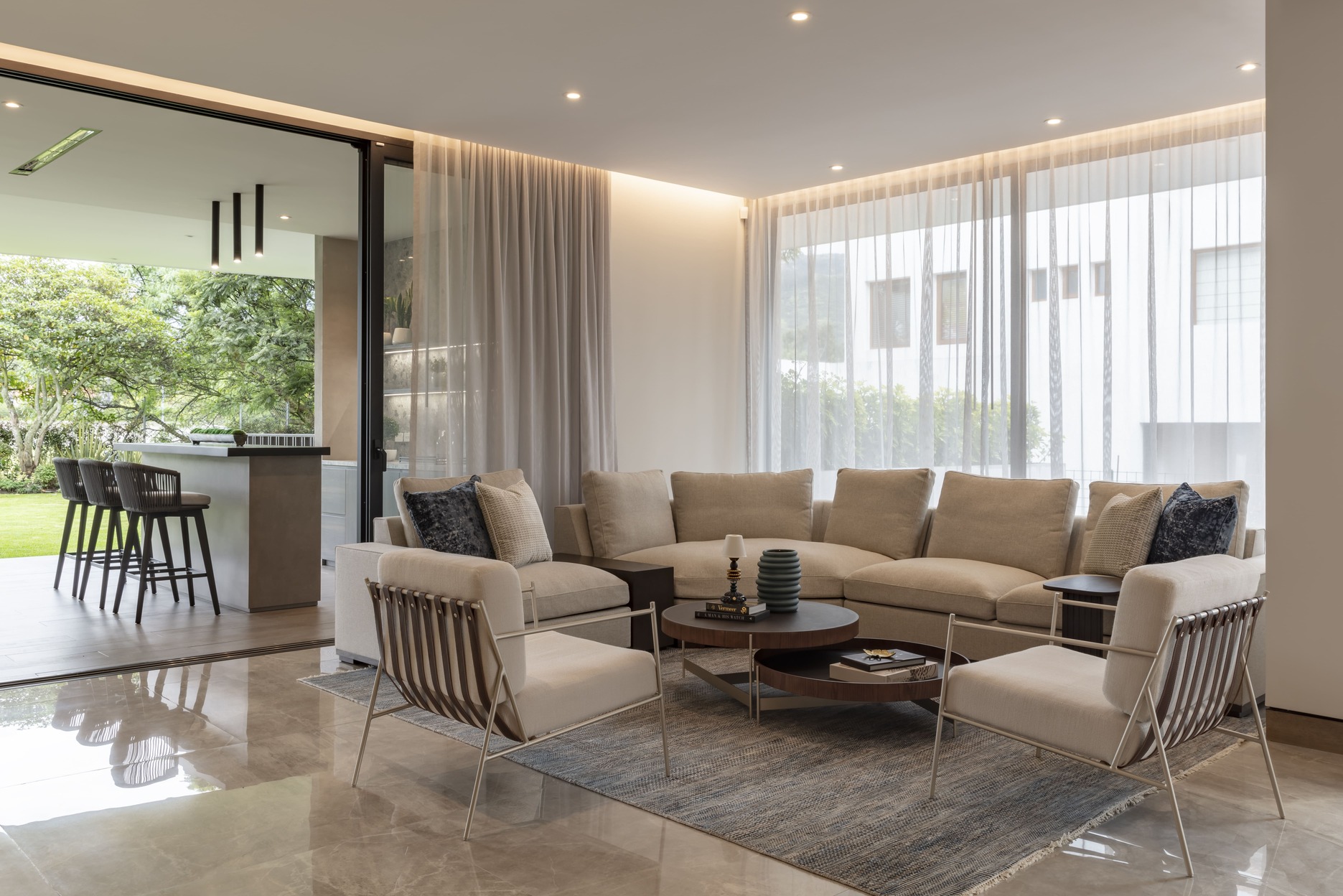 La sala principal se convierte en el corazón de la residencia: amplia, confortable y bañada por la luz del atardecer. Los muebles, diseñados a medida por Adriana Hoyos Design Studio, combinan formas orgánicas y textiles suaves que invitan al descanso.