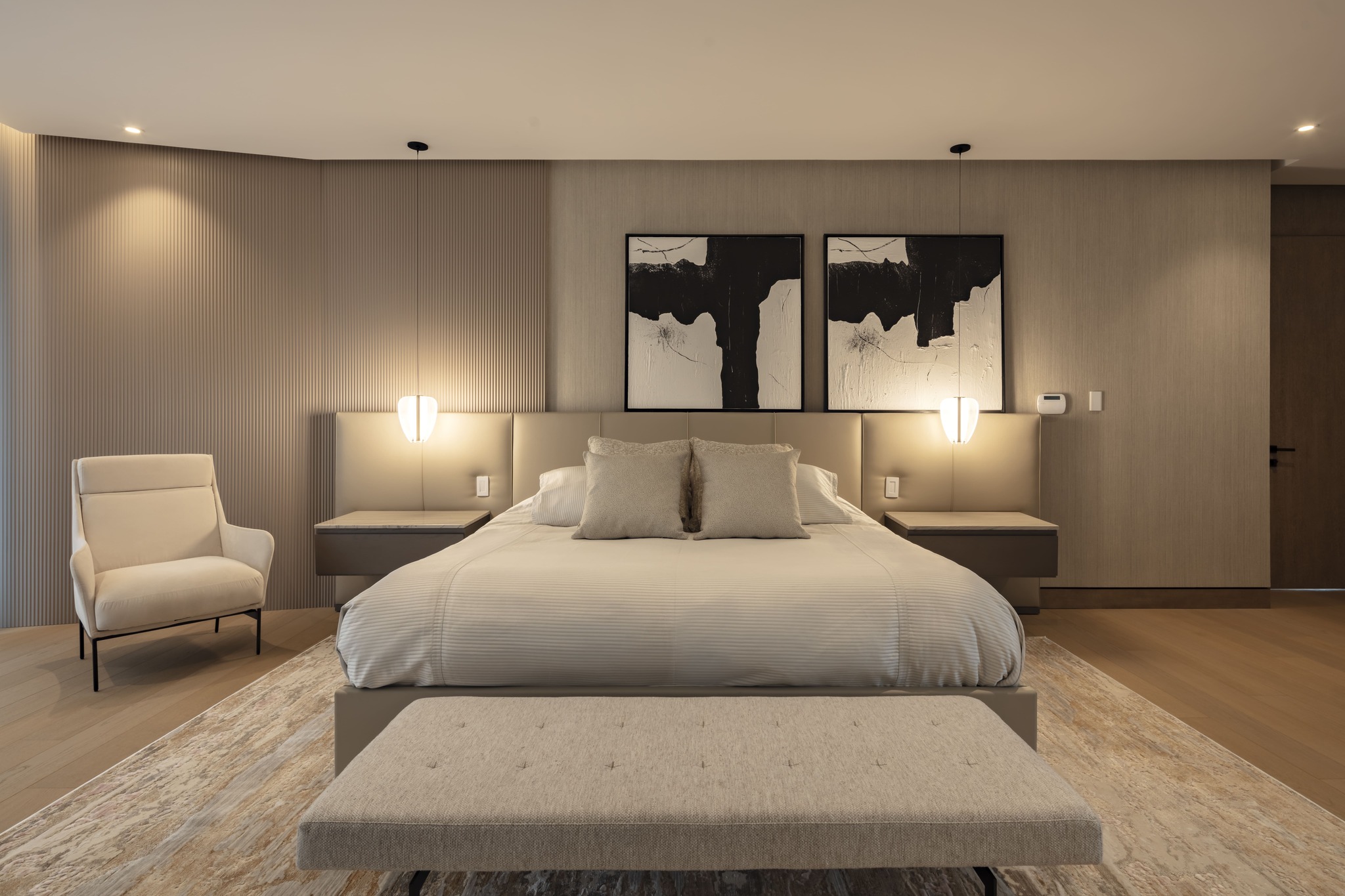 El interior de Sunset Residence se define por una paleta de colores suaves y materiales orgánicos, que construyen una atmósfera de sofisticación sin excesos. Lino, piedra, madera y superficies arenadas se combinan con acentos contemporáneos para crear una estética natural chic que fluye con armonía entre lo artesanal y lo moderno.