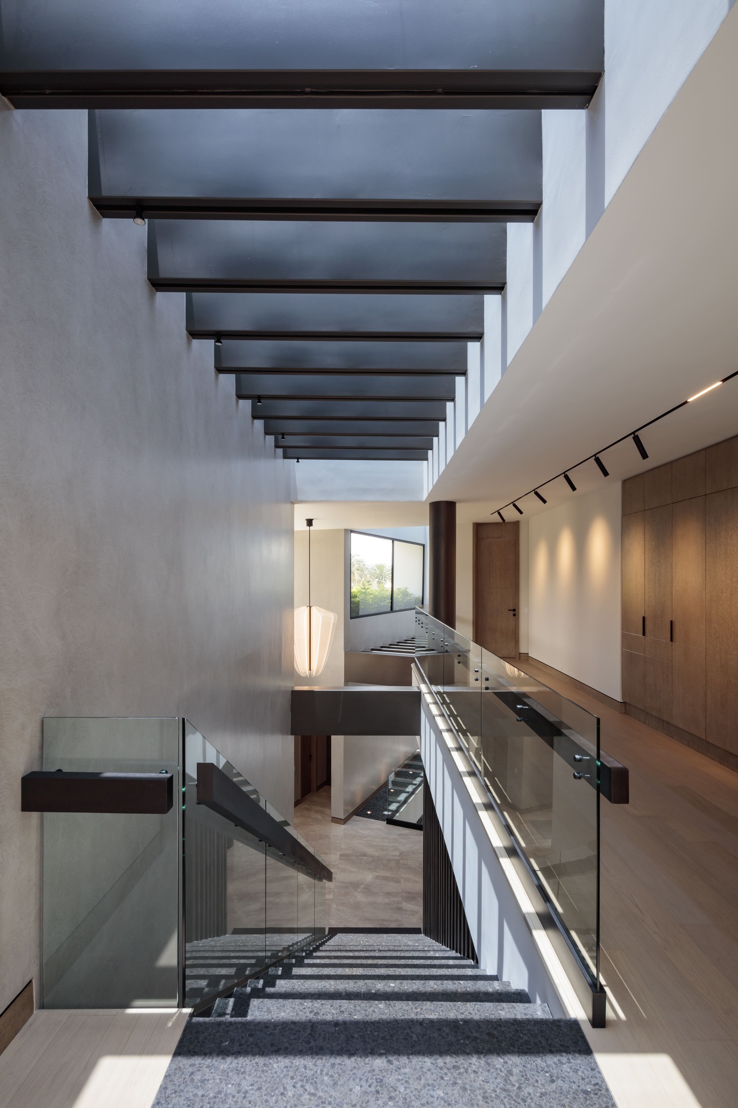 La iluminación natural —abundante gracias a grandes ventanales— se complementa con un diseño lumínico interior cuidadosamente planeado. Las luces cálidas destacan las texturas y refuerzan la sensación de intimidad en las áreas más privadas, como la sala y las recámaras.