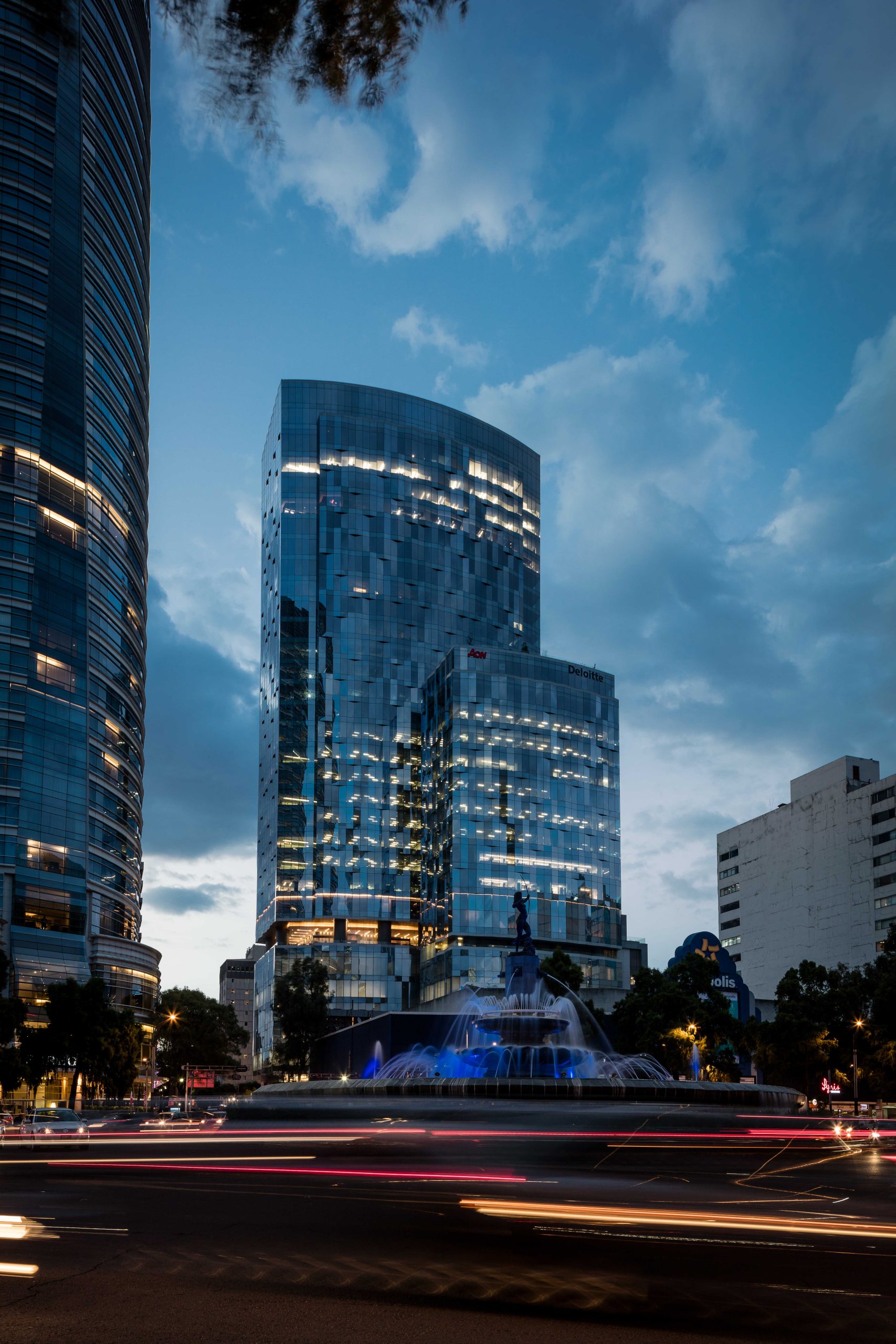 Inspirada en la energía de la Fuente de la Diana Cazadora, la torre traduce movimiento y fluidez en una piel escultural de alto desempeño que controla la radiación solar y maximiza la entrada de luz natural. Esta estrategia técnica y estética permitió que el edificio obtuviera la certificación LEED Gold en 2018, consolidando su compromiso con estándares internacionales de sostenibilidad.