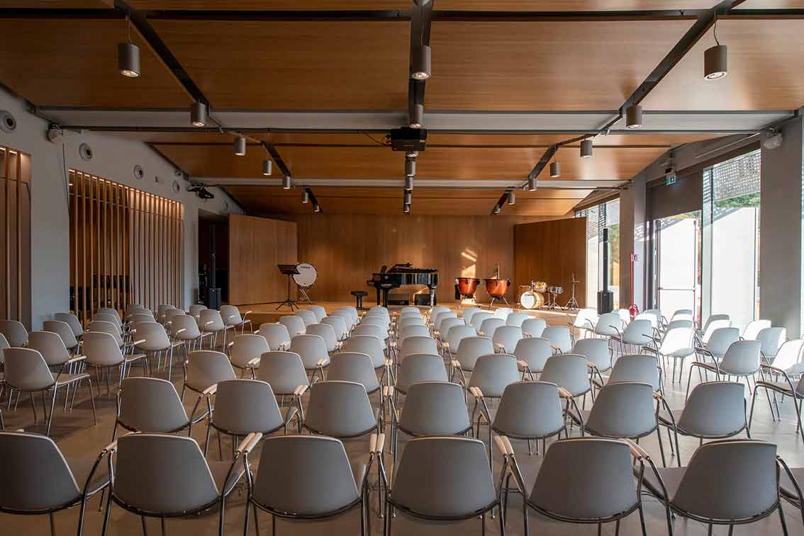 El diseño interior del auditorio, destinado a realzar el espacio a pesar de su tamaño modesto, se caracteriza por el uso dinámico de materiales. Por un lado, la madera de roble de las múltiples superficies y elementos que componen la estancia, como los paneles suspendidos con diferentes inclinaciones, lamas circulares, los paneles que emergen de la pared lateral, y un fondo totalmente revestido de madera y el escenario central con sus paneles giratorios; por otro, el hormigón, que delimita las principales superficies que forjan la estructura, desde el suelo de gres hasta la pared trasera hacia el vestíbulo, y desde la planta superior expuesta a los elementos estructurales. La platea de 180 asientos se distribuye en tres sectores, mientras que en la zona lateral, el camino de los artistas se inserta entre los paneles de madera de la pared y las tiras de altura completa, que –como los tubos de un órgano– dan ritmo al espacio, alternando entre lleno y vacío.