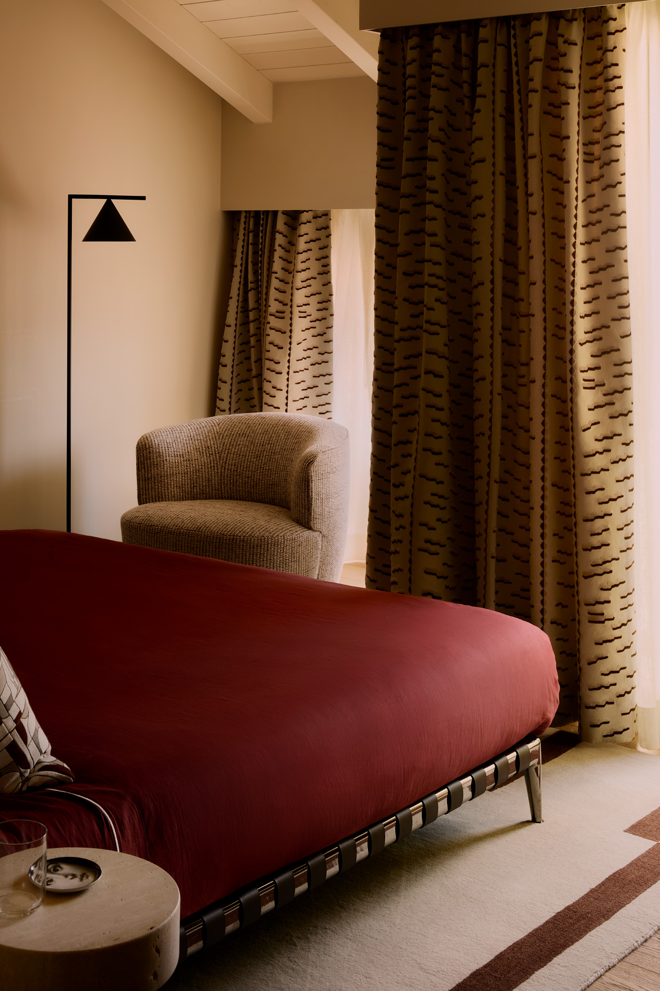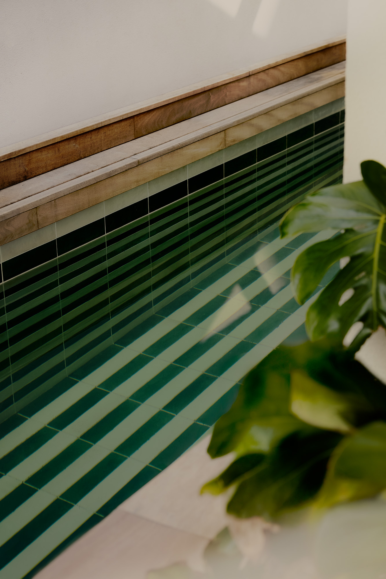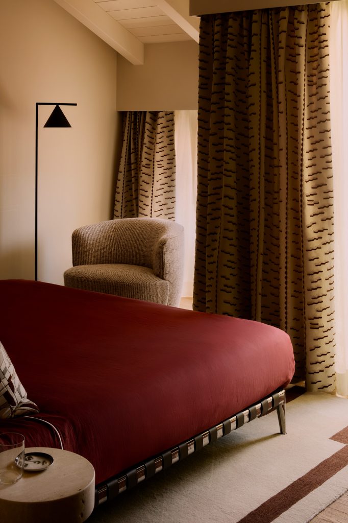 La piscina, revestida con azulejos cerámicos Marazzi en tonos bicolor, parece suspendida sobre el paisaje, generando una sensación de ligereza y lujo discreto. Este umbral visual y físico convierte la vivienda en un refugio doméstico que se abre a la naturaleza sin artificios.