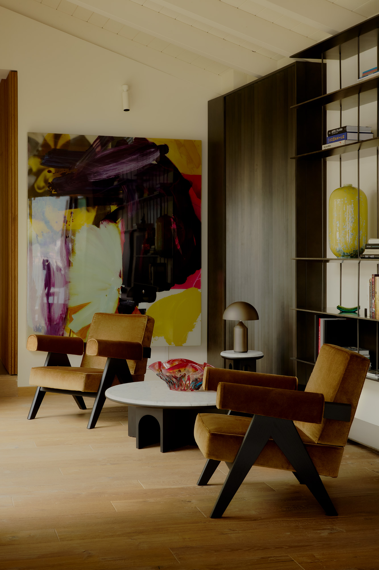 “Era esencial mantener una sensación general de armonía. Cada mueble fue elegido para integrarse de forma natural y fluida en el espacio”, afirma Pierattelli. El mobiliario combina piezas de las principales marcas italianas con elementos empotrados diseñados por el estudio, como armarios, librerías y sistemas de iluminación indirecta.
