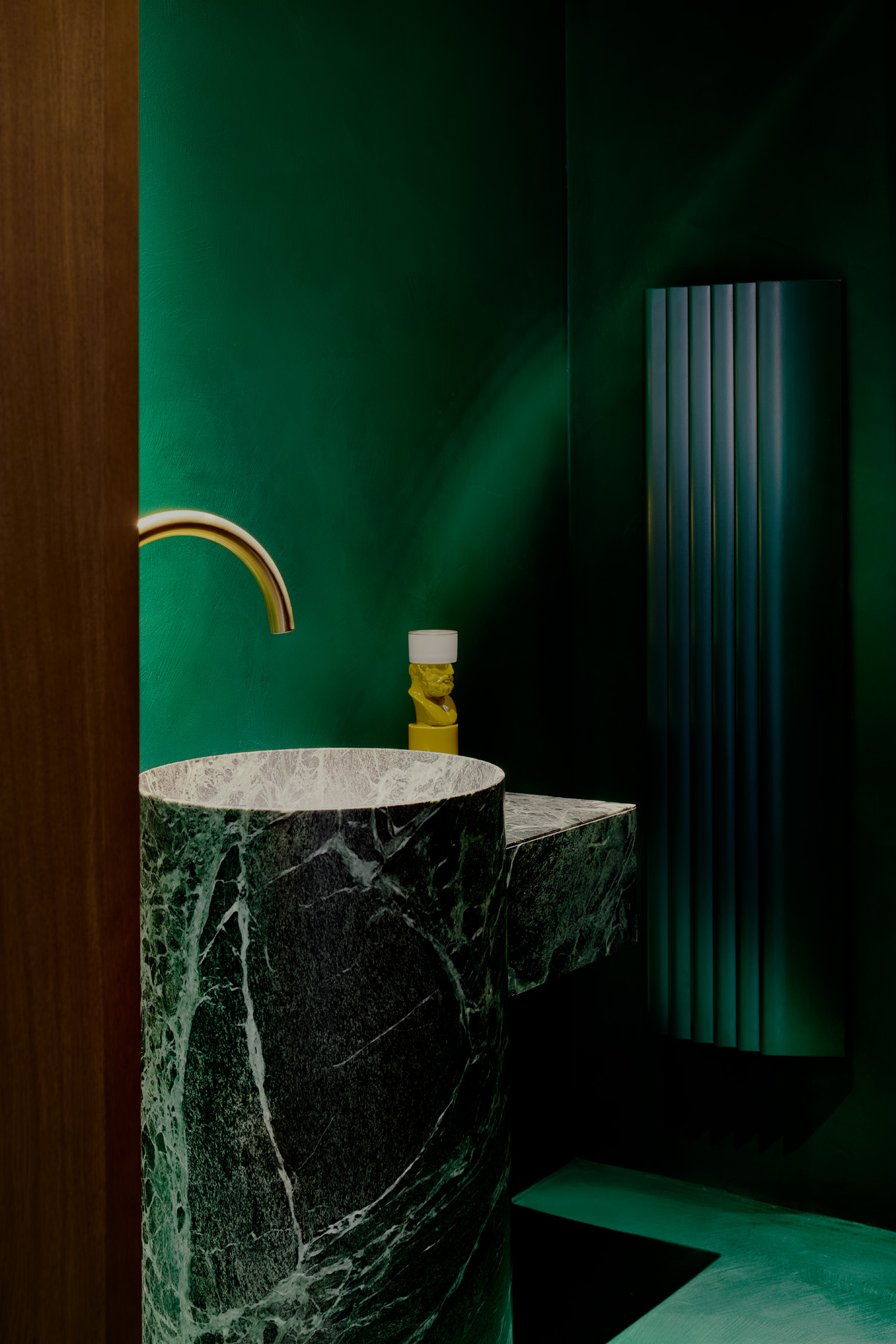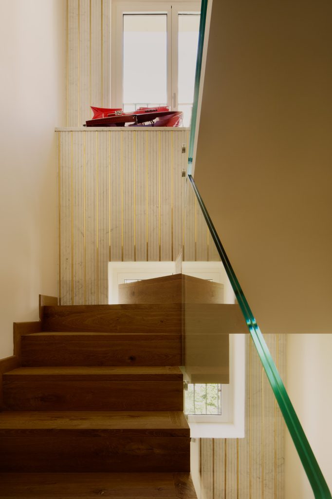El interior fue concebido como un sistema coherente de materiales, texturas y proporciones. Una boiserie de roble color miel, diseñada a medida por Pierattelli Architetture, enmarca el salón y la cocina. Esta última combina mármol Arabescato blanco Luce di Carrara con grifería de latón natural, pensada para envejecer con el tiempo y desarrollar una pátina única.