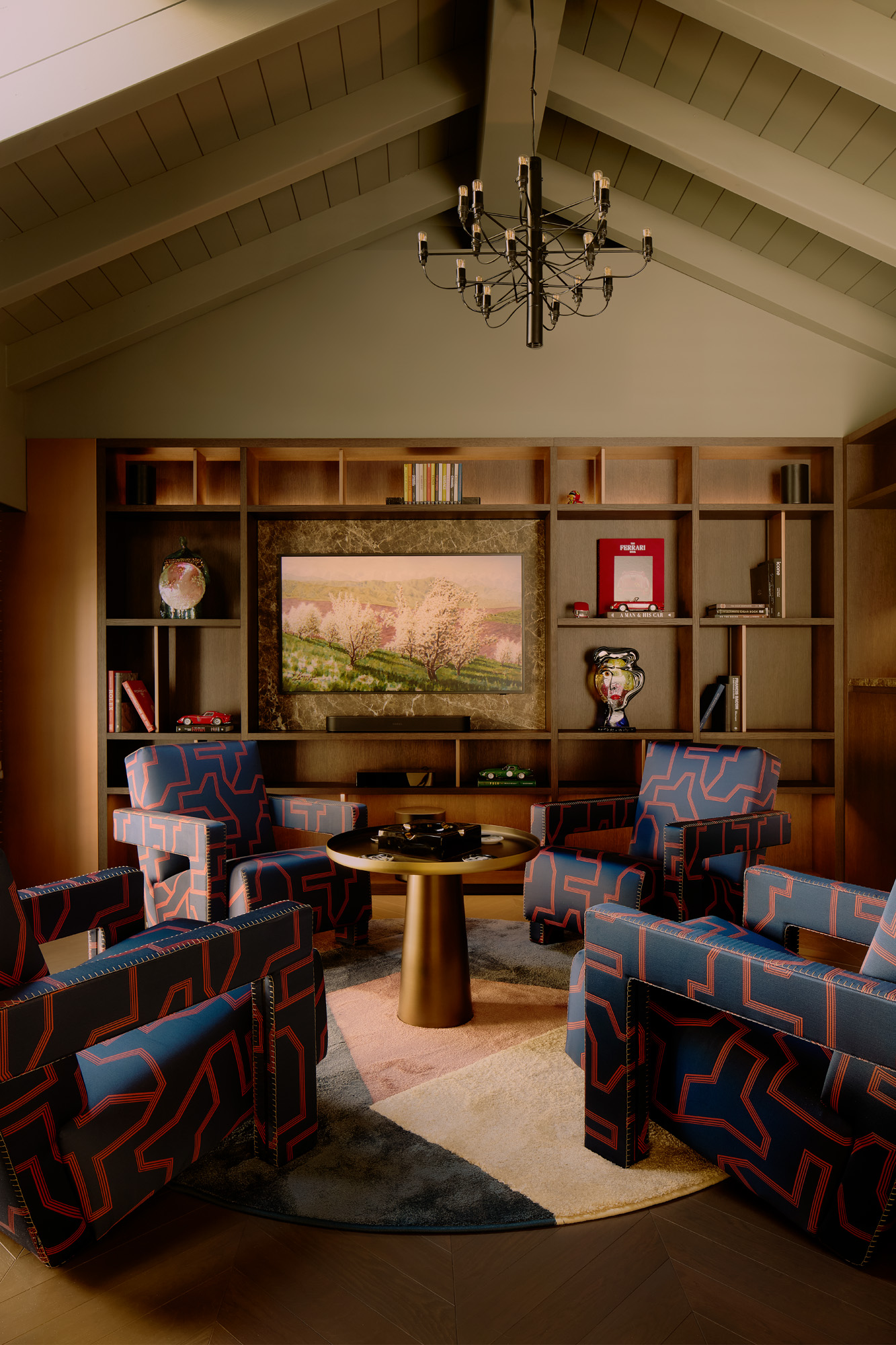 Planta superior: el Salón de los Cigarrillos, un rincón íntimo con sillones Cassina, textiles Dedar, persianas de madera y un mueble bar con sistema de sonido integrado.