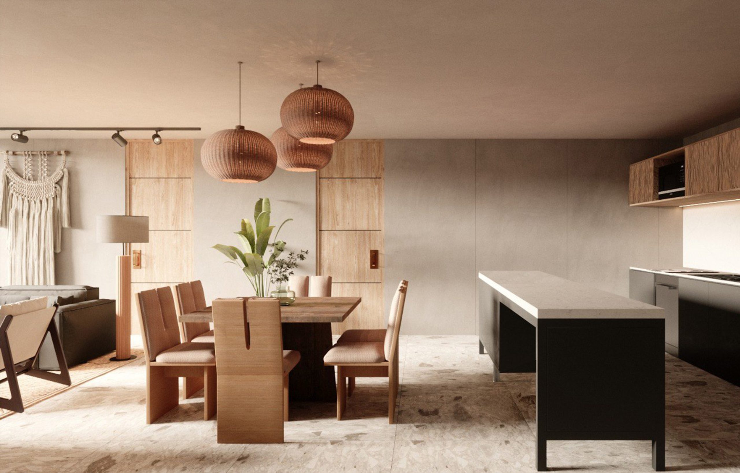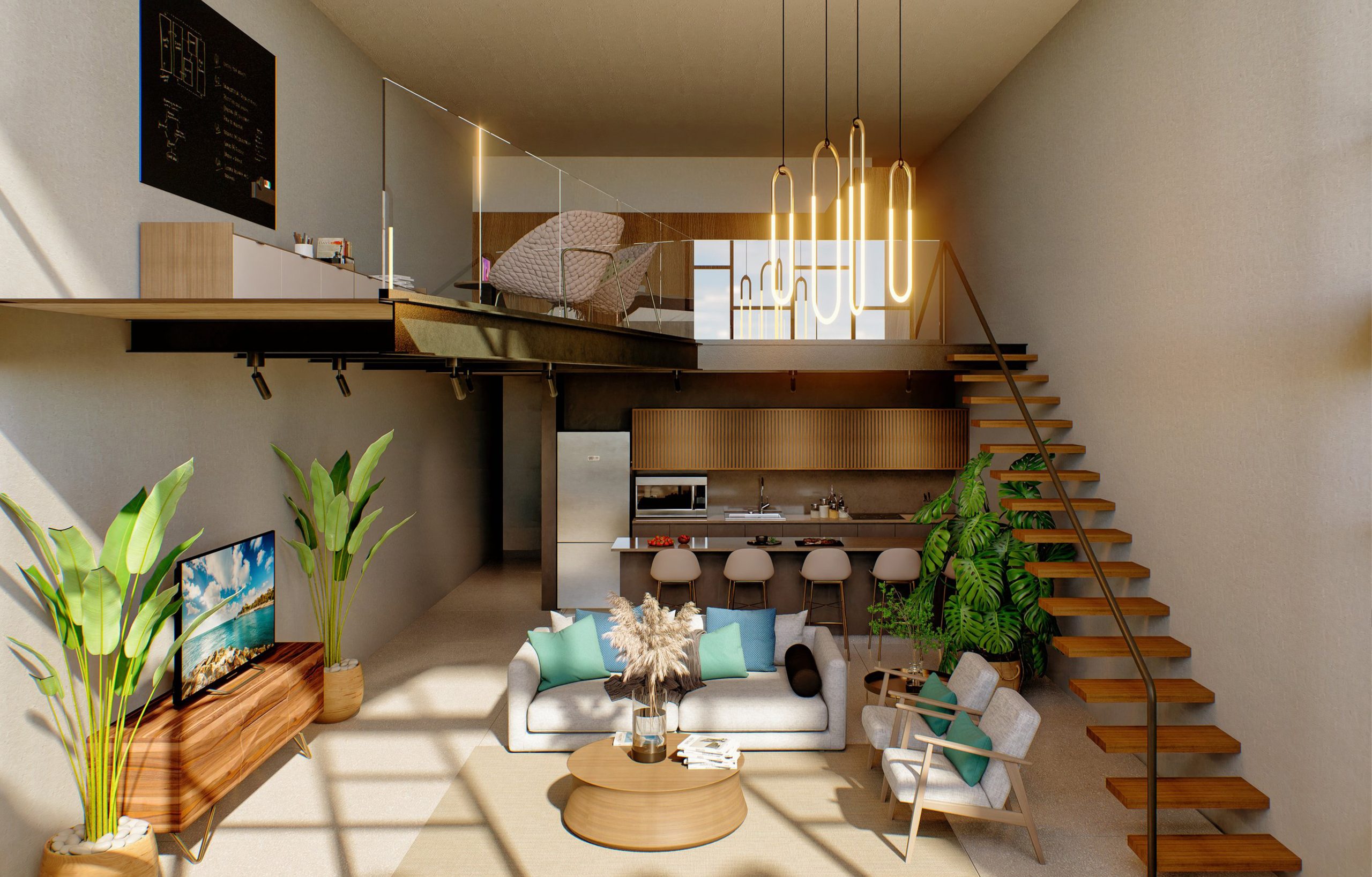 Las unidades residenciales —que van de 1 a 2 recámaras, con lofts de doble altura— cuentan con cocinas de acero inoxidable, acabados en porcelanato, minisplits inverter y closets de madera fina. Terrazas privadas que permiten conectar con el clima, el aire y la arquitectura.