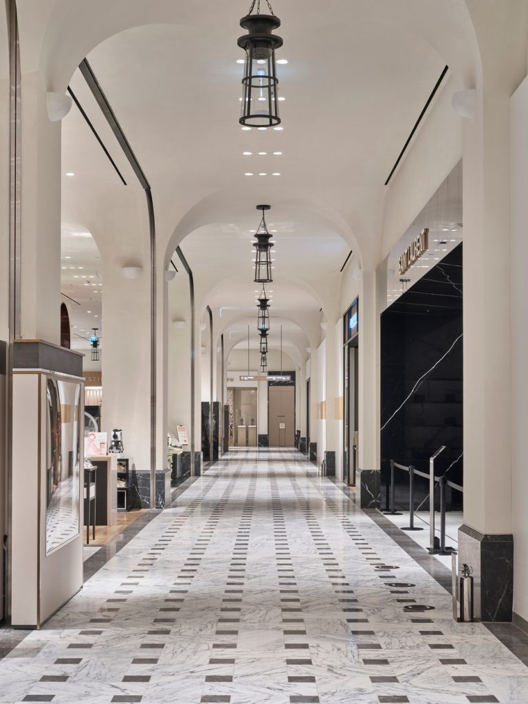 Para darle vida a la primera planta, JHA reinterpretó elementos de diseño clásicos, como los techos abovedados, utilizando yeso blanco hueso y lámparas colgantes decorativas personalizadas que resaltan las vías de circulación. El suelo re-imagina un mosaico italiano, pero con un diseño contemporáneo con losas de mármol negro contra y blanco Véneto.